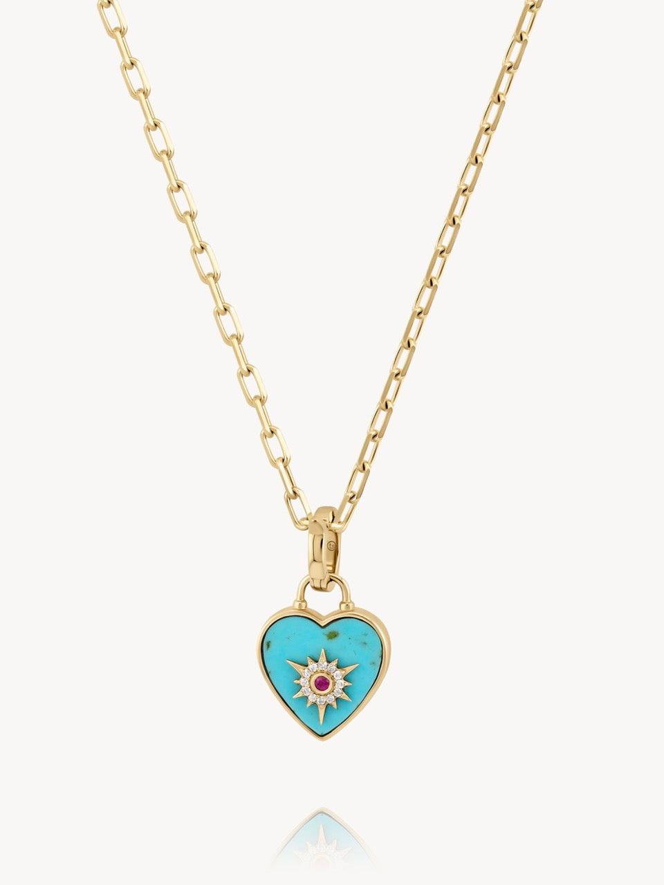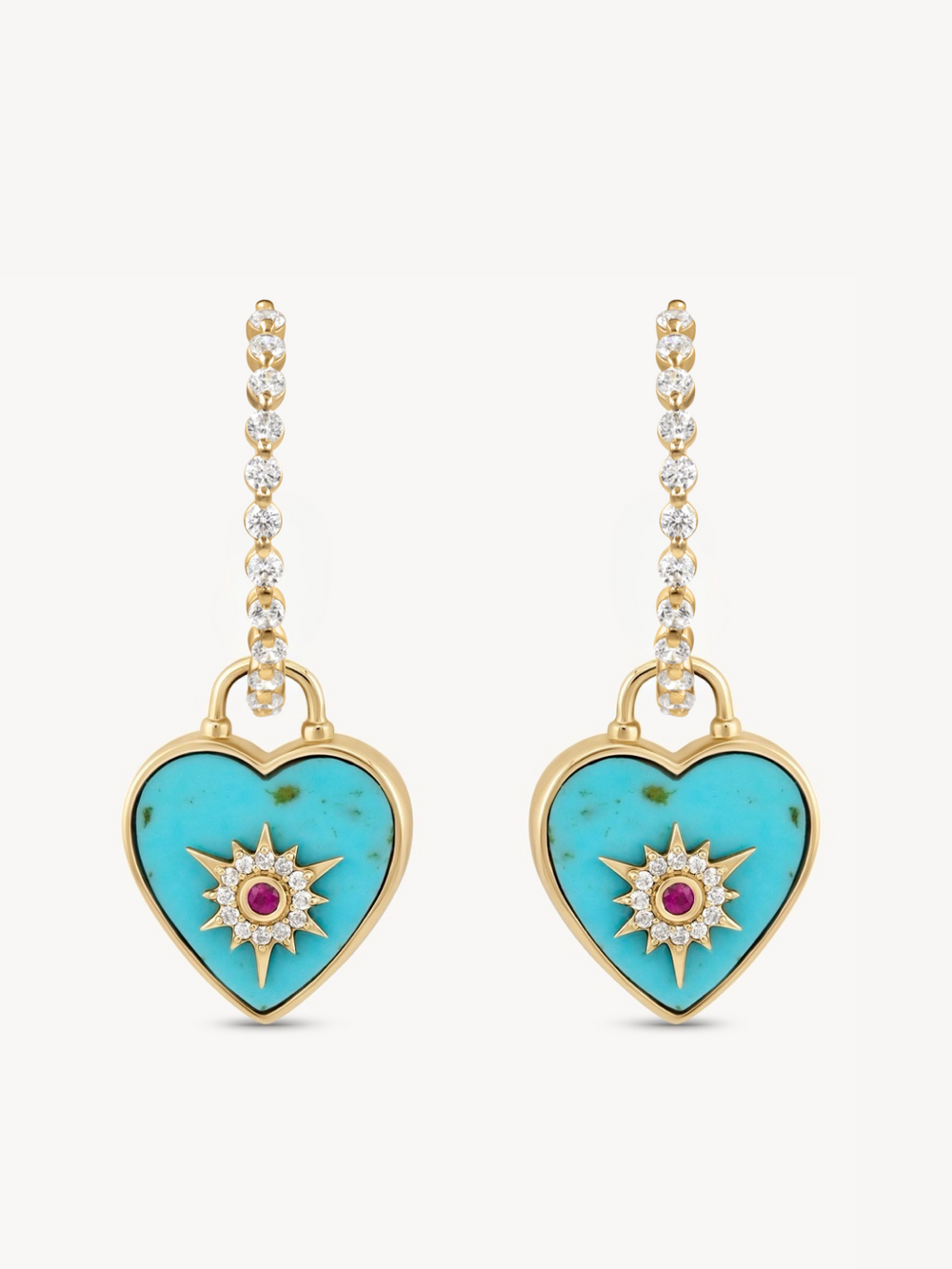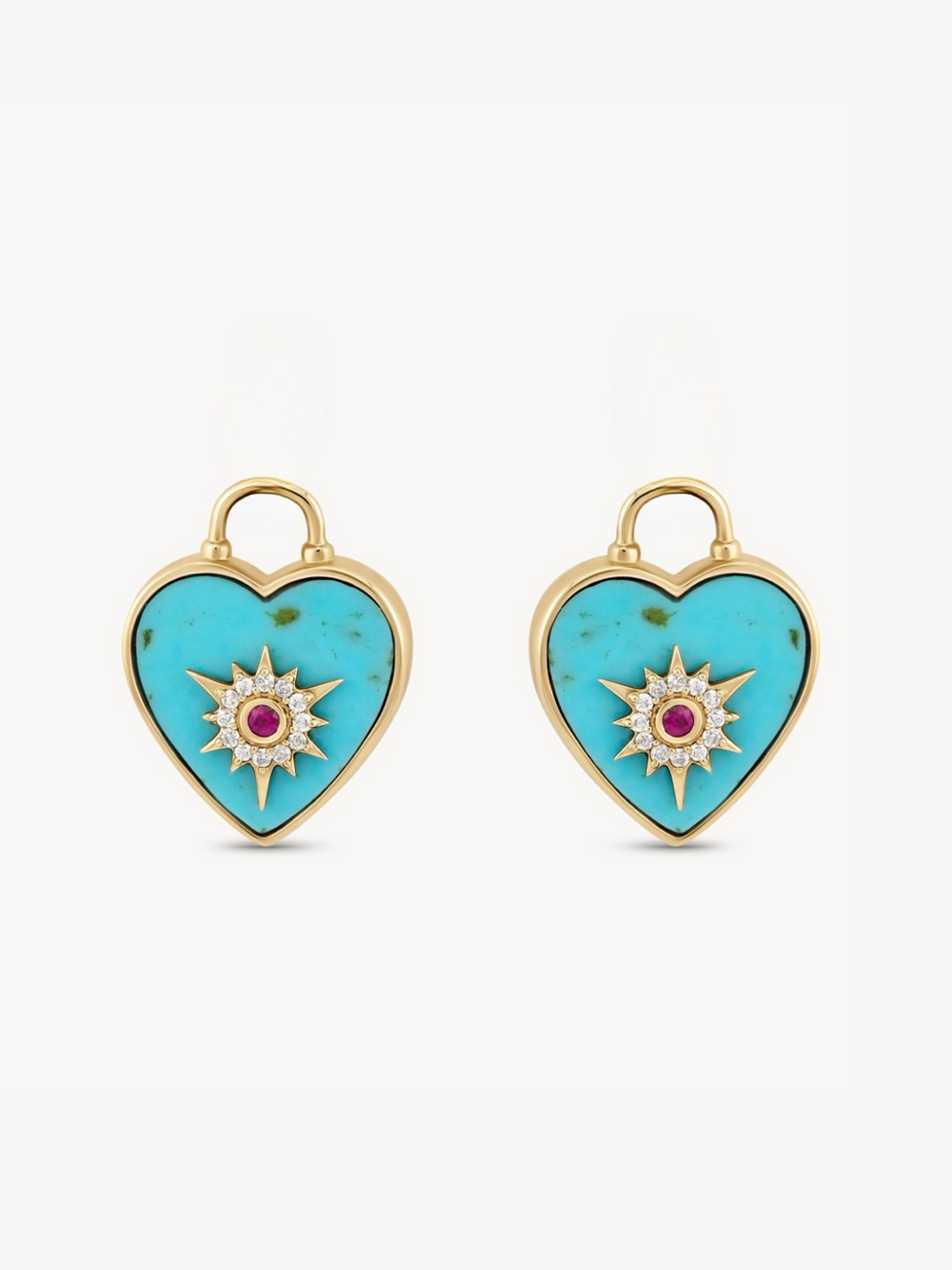 This natural turquoise tablet is set in 14k yellow gold with a gold and diamond starburst exploding from it. A single red ruby sparkles in the center. Wear on hoop earrings or add an openable pendant bail and wear on a chain necklace or bracelet.