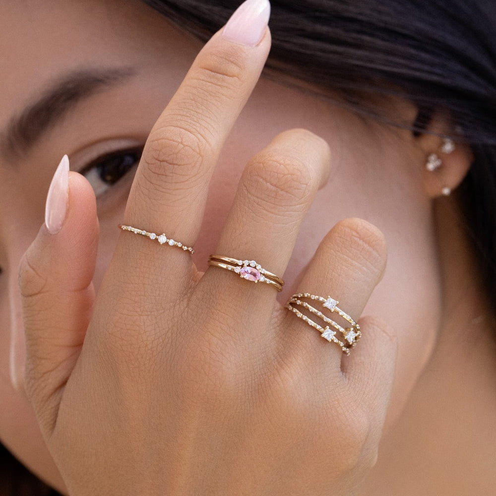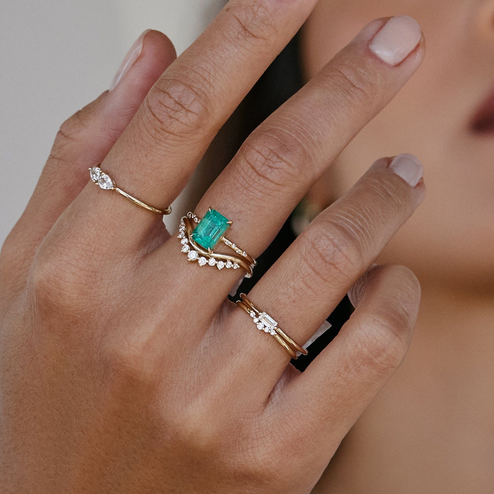 This beauty is petite with an abundance of sparkle! Featuring five floating bright white Diamonds set in a gentle curve, this delicate piece is perfect nestled against any ring in your collection, while being equally as radiant worn on its own.