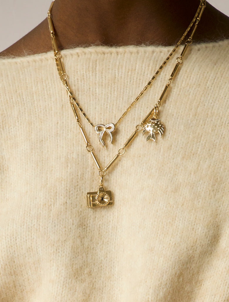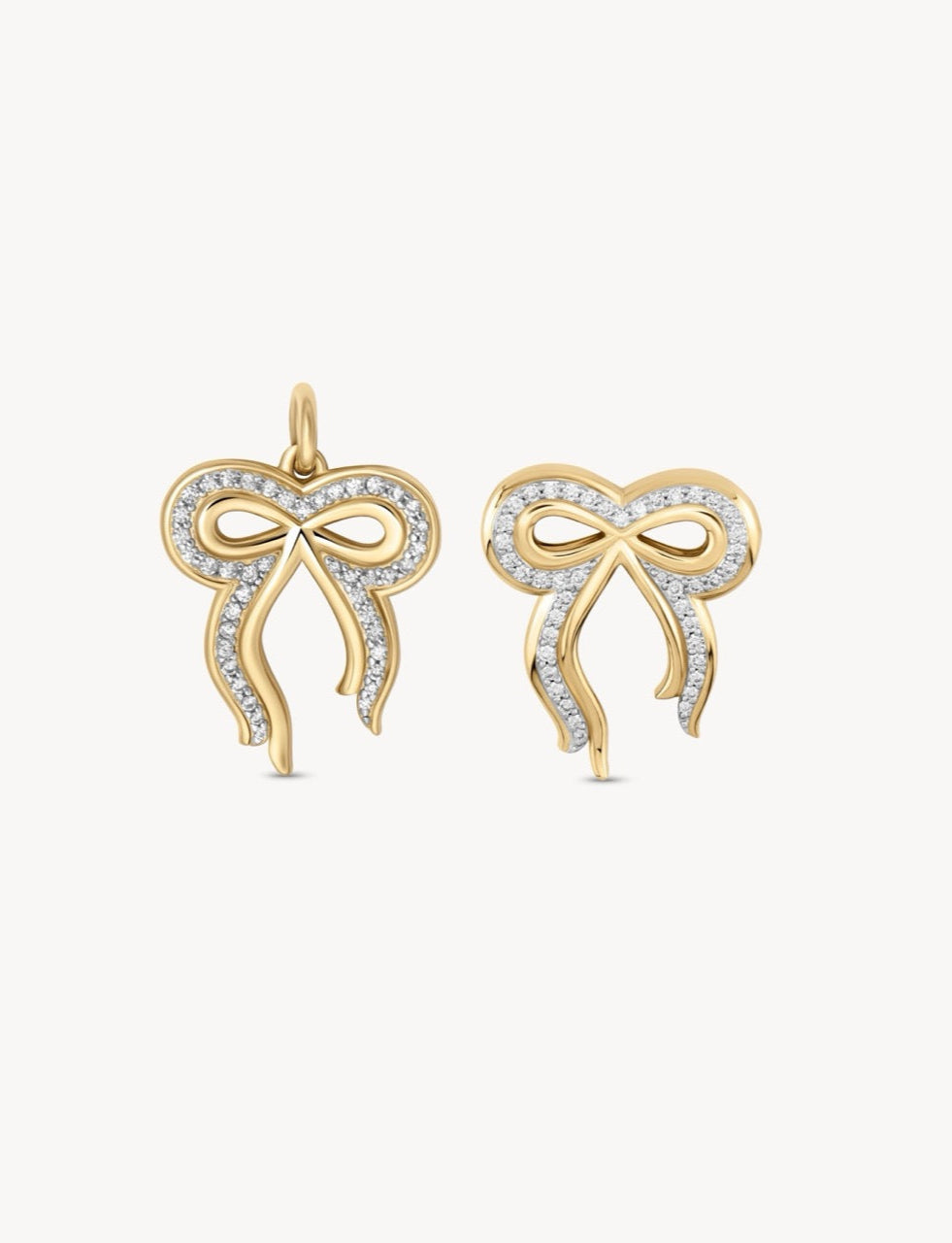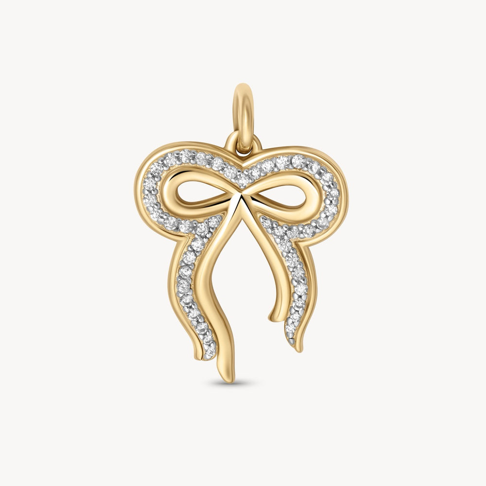 A symbol of sweetness and strength, our Diamond Bow Charm is designed with an open shape and flowing lines that give it movement, while pavé-set diamonds trace the edges for subtle light. Handcrafted in 14k solid yellow gold, it is available as a charm with a top bail or a pendant with hidden back loops. Designed to add a delicate touch of sentiment to any chain or charm necklace.