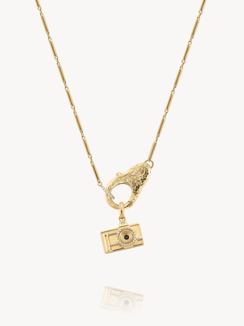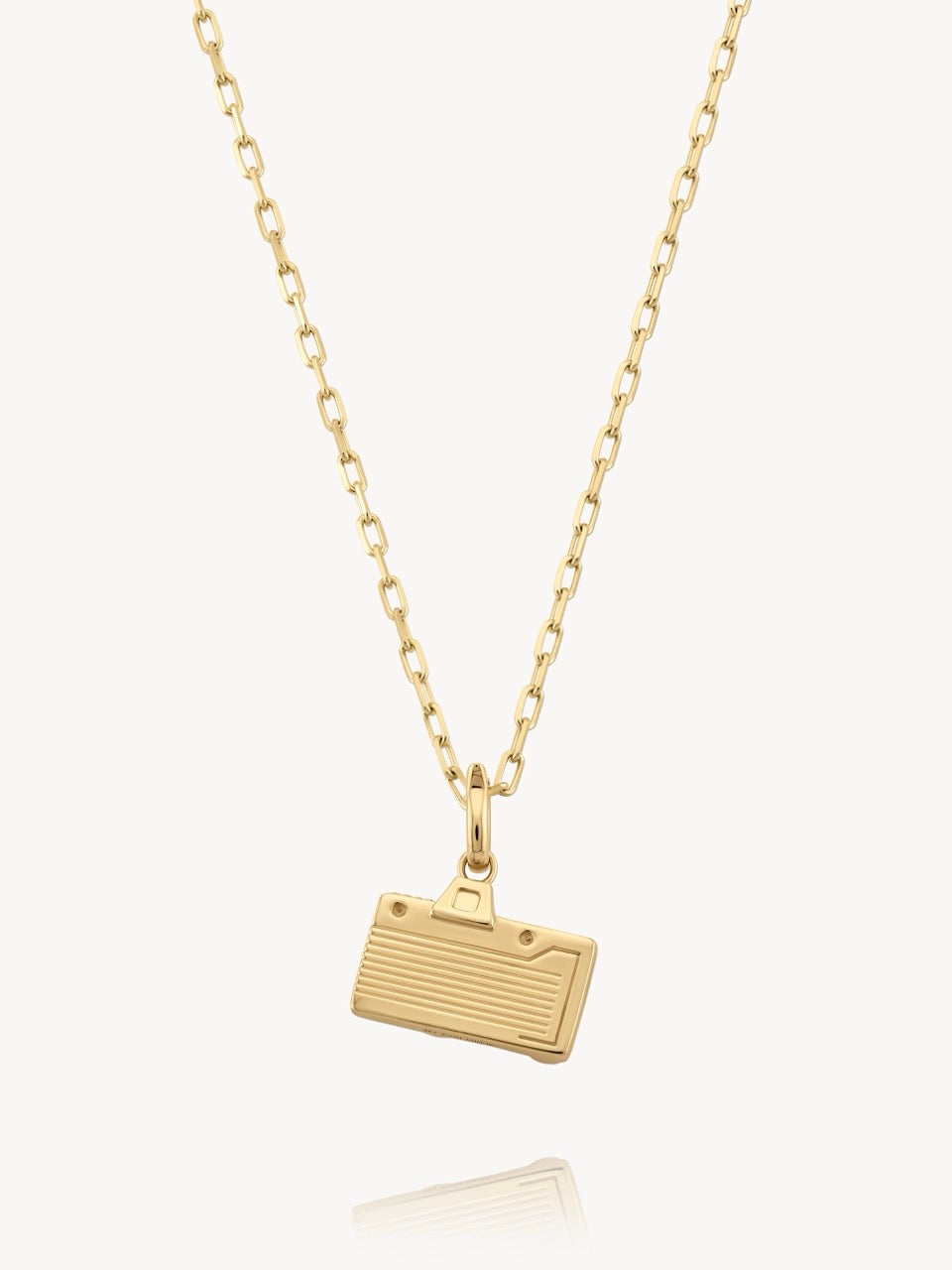 A golden nod to nostalgia, this solid 14k yellow gold camera charm honors the art of seeing beauty in every detail. Crafted with precision and intention, it’s weighty in feeling, never hollow, and made to last a lifetime. A natural black diamond defines the lens, while a baguette-cut white diamond illuminates the viewfinder, echoing the light of a real camera. Designed with character and crafted with care, it’s a meaningful keepsake meant to be worn, loved, and remembered.
