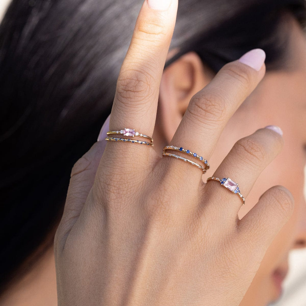 Praised for their strength and wide variety of vibrant blue hues, this band features gradients of Sapphire sparkle flanked by the shimmer of our signature Starry Diamonds. Perfect for stacking with all of your favorite Audry Rose Starry Signatures!