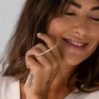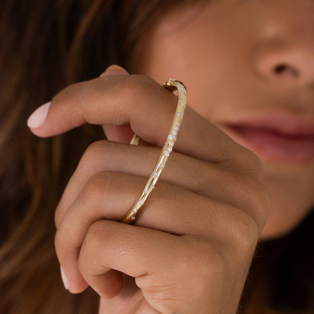 A scattering of Diamond stardust twinkles across the surface of our hinge bangle bracelet. Inspired by a distant cluster of stars, this elegant piece is comfortable on your wrist and is full of celestial magic!
