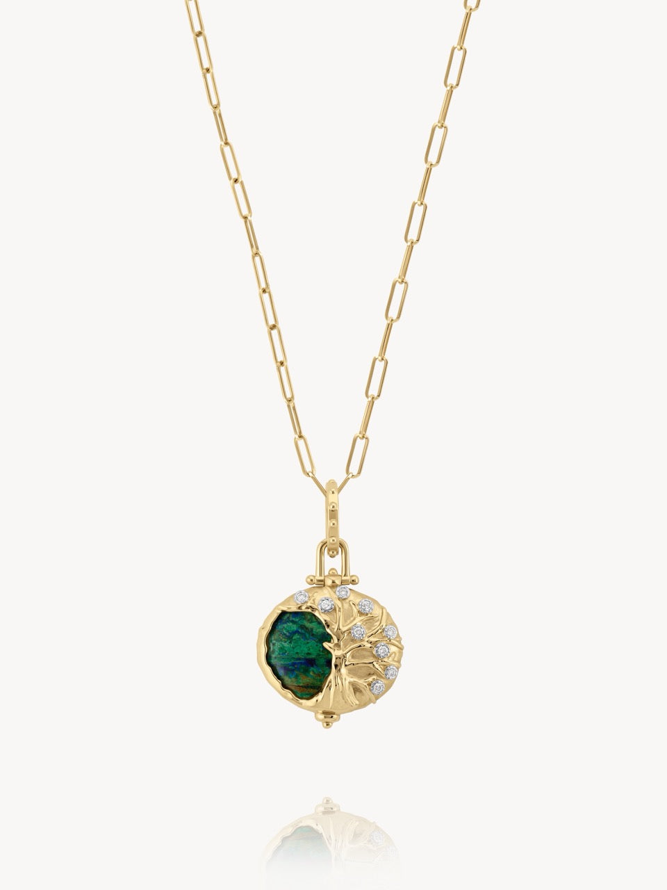 The tree of life represents beauty, hope and strength, each branch reaching up and growing toward the sparkling sky. Handmade with 14k Yellow gold detailed with a diamond tree overlaid on a cabochon azurite. This pendant can be attached to a chain necklace or bracelet.