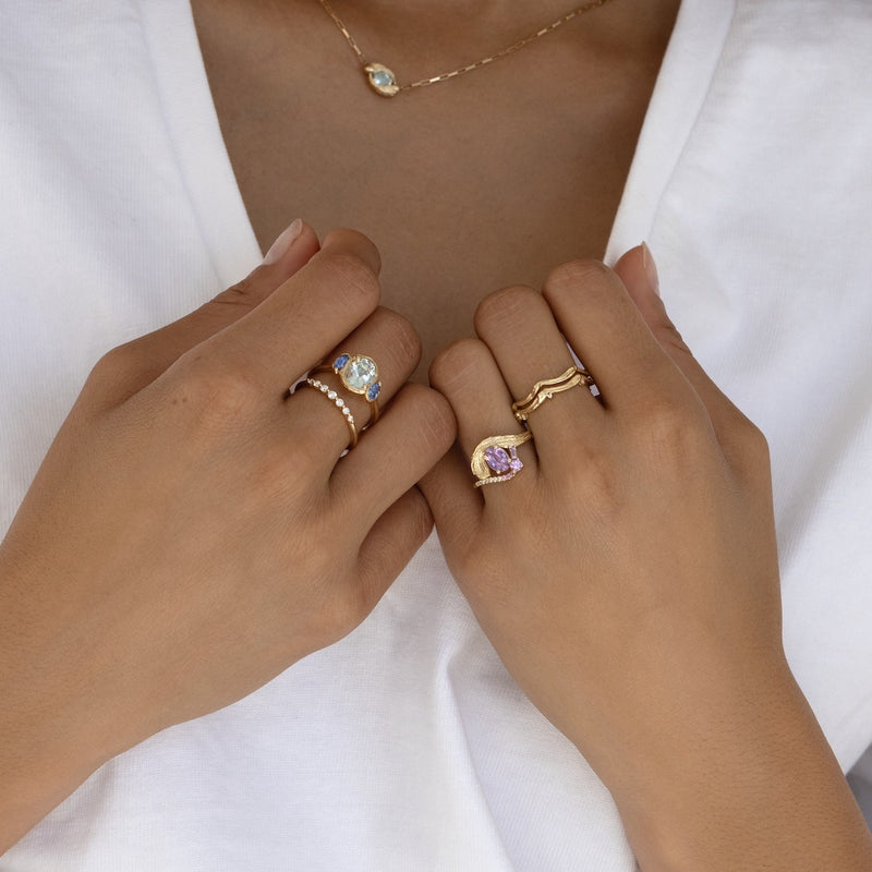 From Le Conte's stunning Impasto Collection! Impasto is a type of technique in oil painting, which describes visible brush-stroke textures on the surface. Handcrafted with precision and care, the Maya Blue features two french blue sapphires and a dazzling brilliant cut aquamarine that sparkles with every moment. Like its name, the center stone holds a unique blend of green and blue hues, perfect to make that statement.