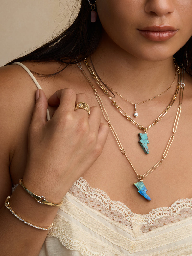 The lightning bolt has long represented strength, protection, and transformative energy, making it a powerful symbol in both cultural narratives and jewelry design. When paired with the natural energy of stones, it creates a personalized talisman that is deeply rooted in the earth and uniquely resonates with you.