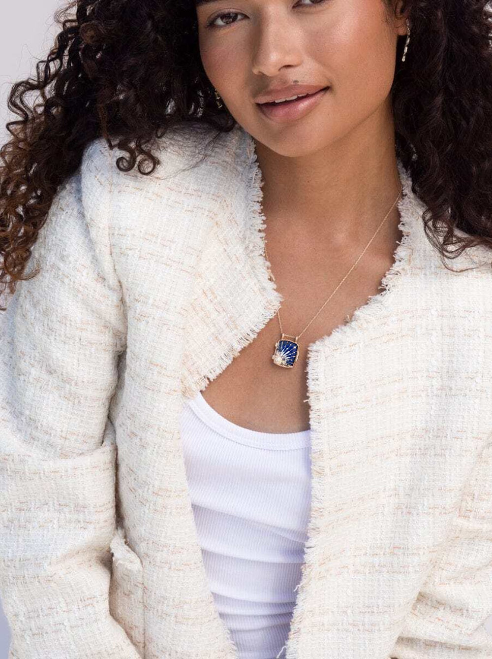Celine Daoust 14k light yellow gold sun and diamond beams locket necklace with a made-to-fit lapis lazuli necklace. The locket can be opened and the lapis removed. There is an opening to the back of the locket for the lapis lazuli to touch your skin.