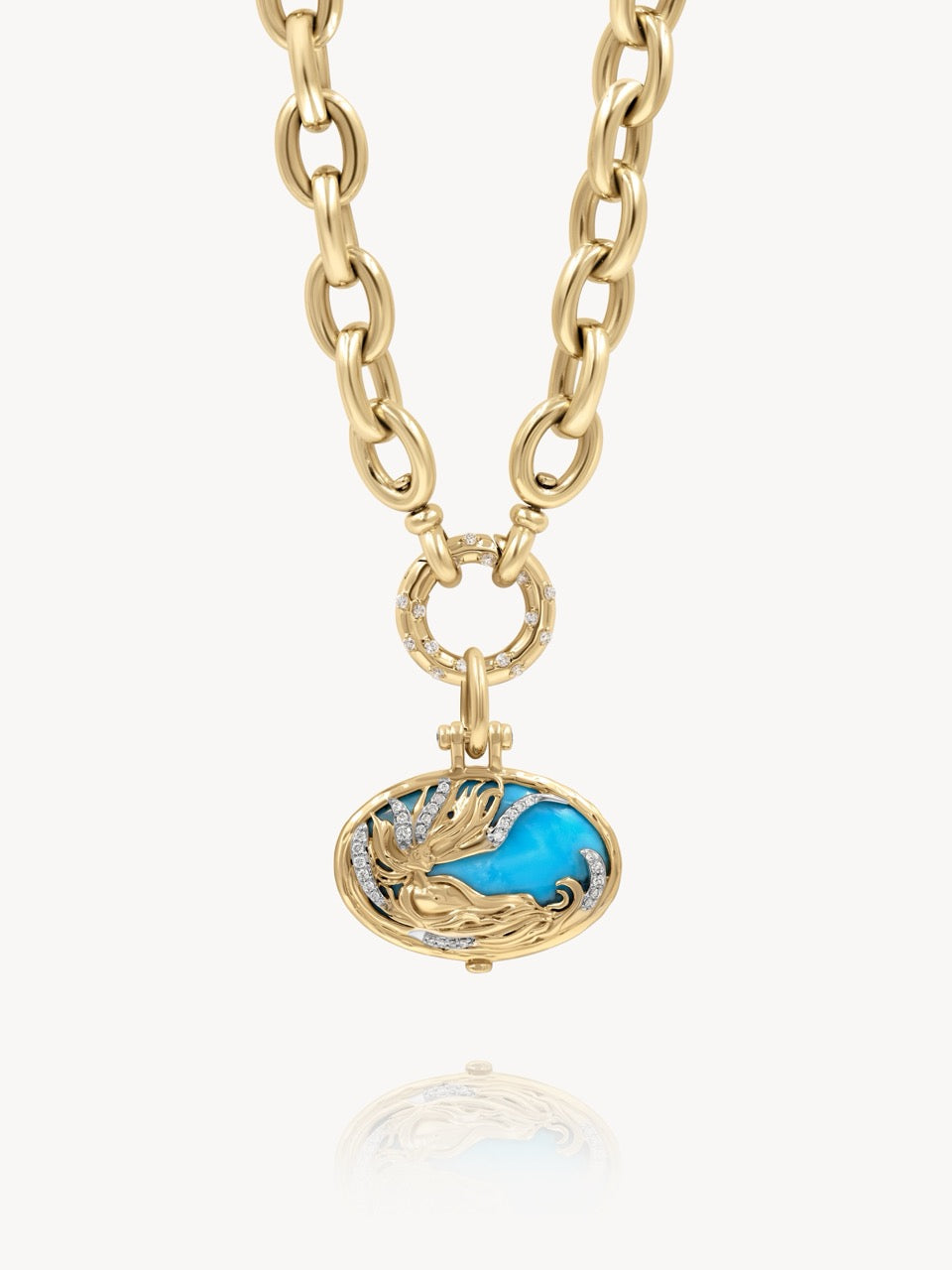 Emerging from the sparkling sea, the sea goddess represents strength, hope, and female empowerment. This pendant showcases the stunning sea goddess in 14k yellow gold and sparkling diamonds overlaid on an oval natural turquoise on one side and the sunrise over the ocean on the back.