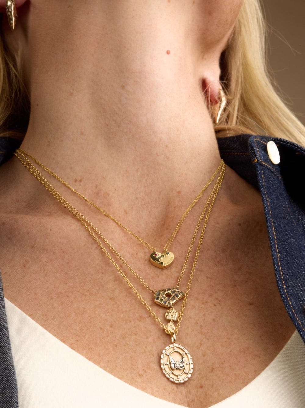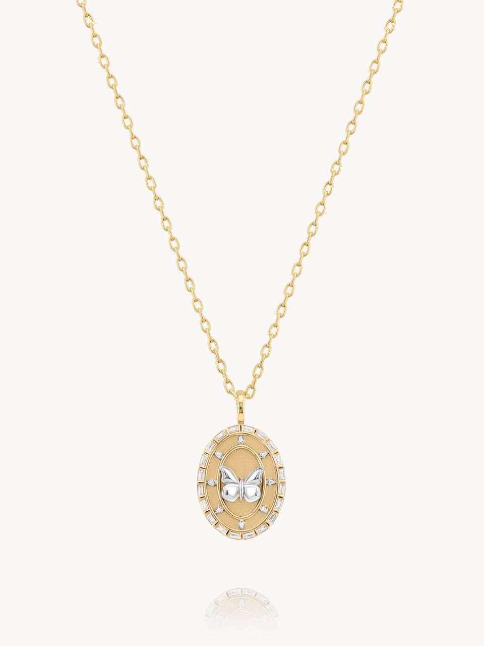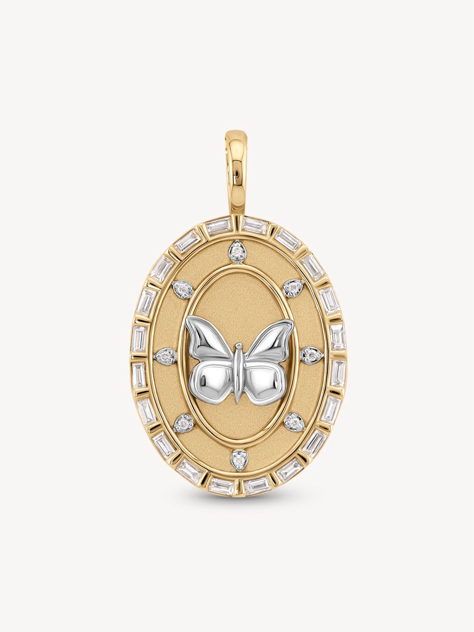 Created to honor transformation and the quiet beauty of growth, the Butterfly Talisman carries the soft strength of becoming. The three-dimensional sculpted rhodium butterfly rises from a matte yellow gold background, catching the light with a gentle shimmer. The oval silhouette is framed with baguette diamonds that create a soft, textured glow, while round diamonds add a subtle touch of brightness. This pendant is designed to evoke both grounding and uplifting feelings, serving as a reminder that change can be delicate, intentional, and full of promise.