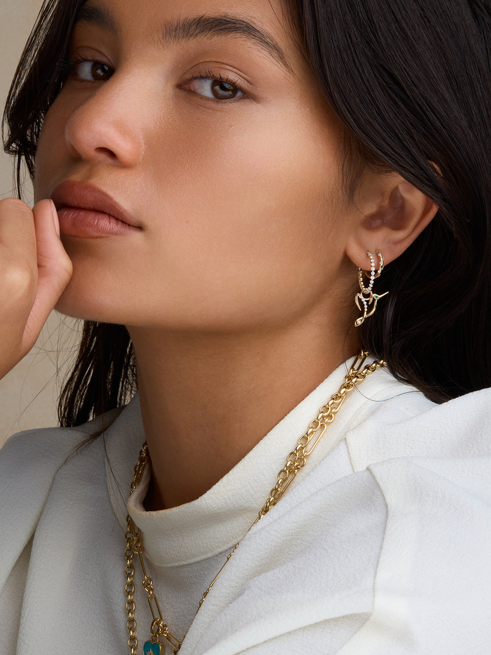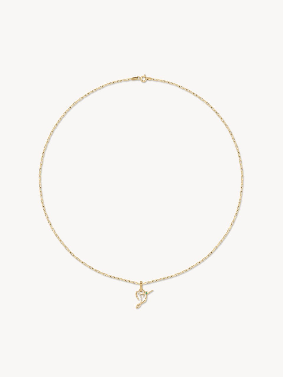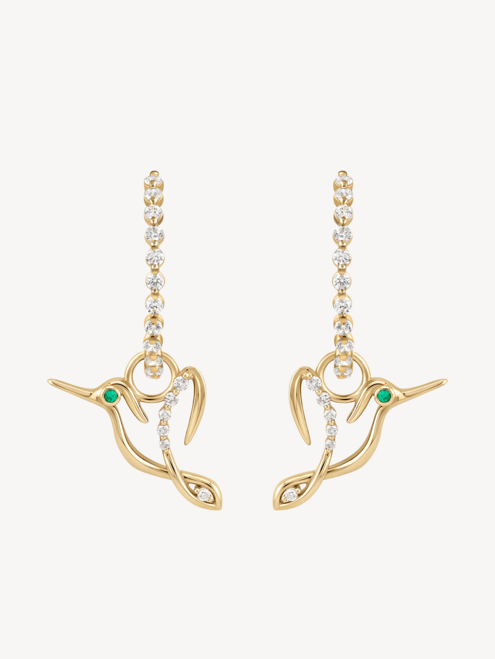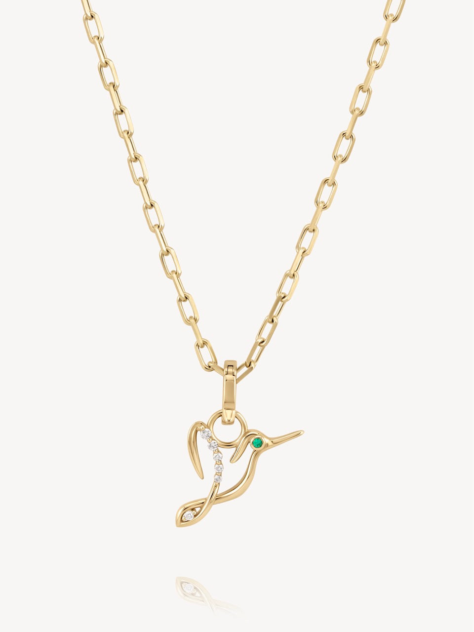This charm features a delicate hummingbird silhouette crafted in 14K yellow gold. The open design creates a light, airy feel while maintaining the distinctive shape of this beloved bird. The hummingbird's eye is highlighted with a vibrant emerald, while prong set diamonds adorn its graceful form, adding sparkle to its flight.