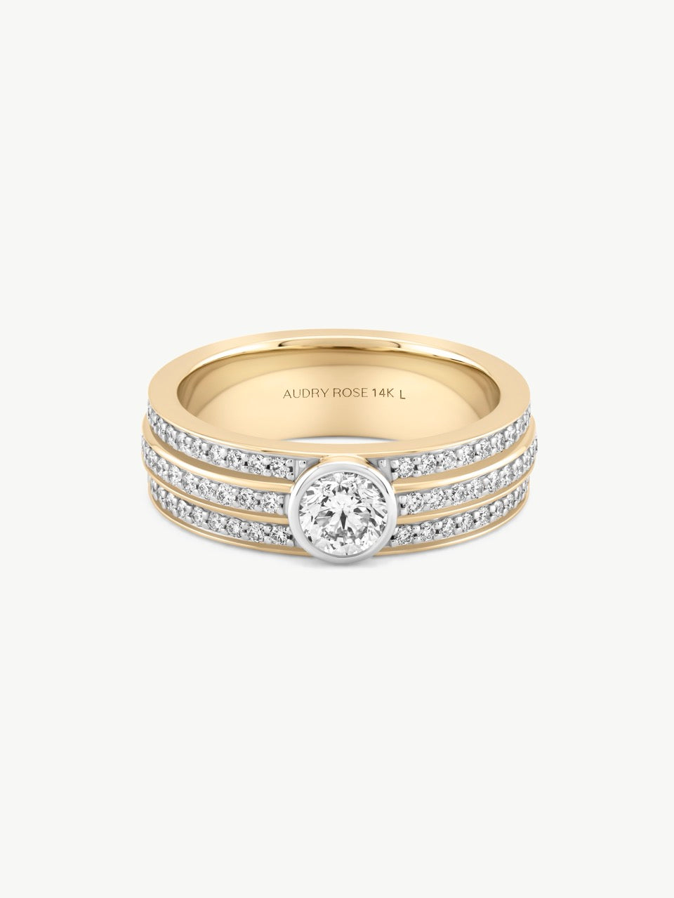 This ring features a round diamond set in white rhodium, framed by three pavé-set rows that create the look of perfectly stacked bands in one seamless piece. Handcrafted in solid 14k yellow gold, it’s distinguished by clean lines, subtle contrast, and lasting brilliance, and it brings a polished mix of structure and sparkle to any collection.