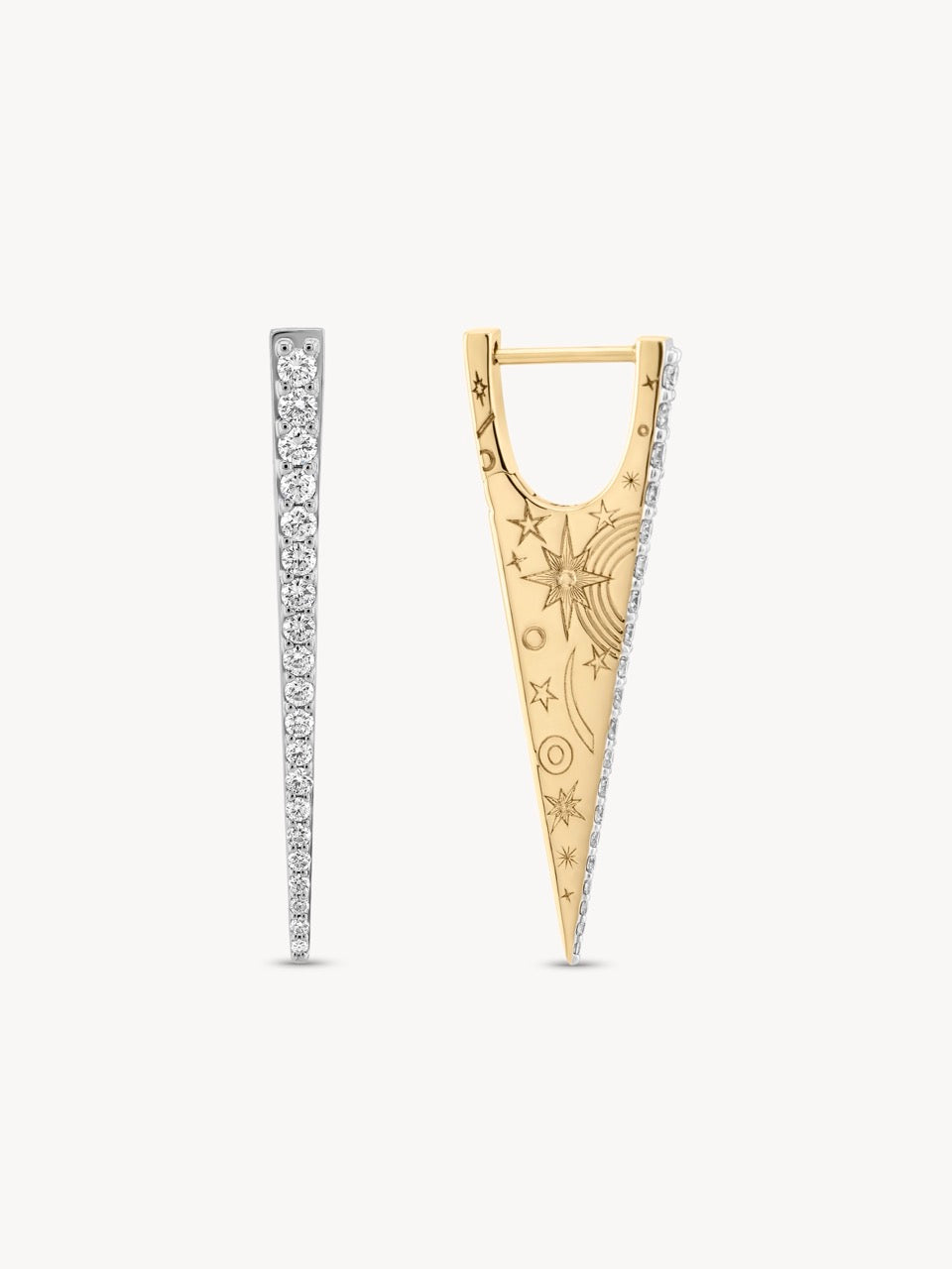 Meet the Single Elongated Diamond "V" Hoop Earring in 14K yellow gold. This edgy stunner boasts pavé diamonds with a total of 0.25 TCW GSI diamonds, making it a true head-turner. With engraved sides for extra flair, it's not just an earring, it's a statement.