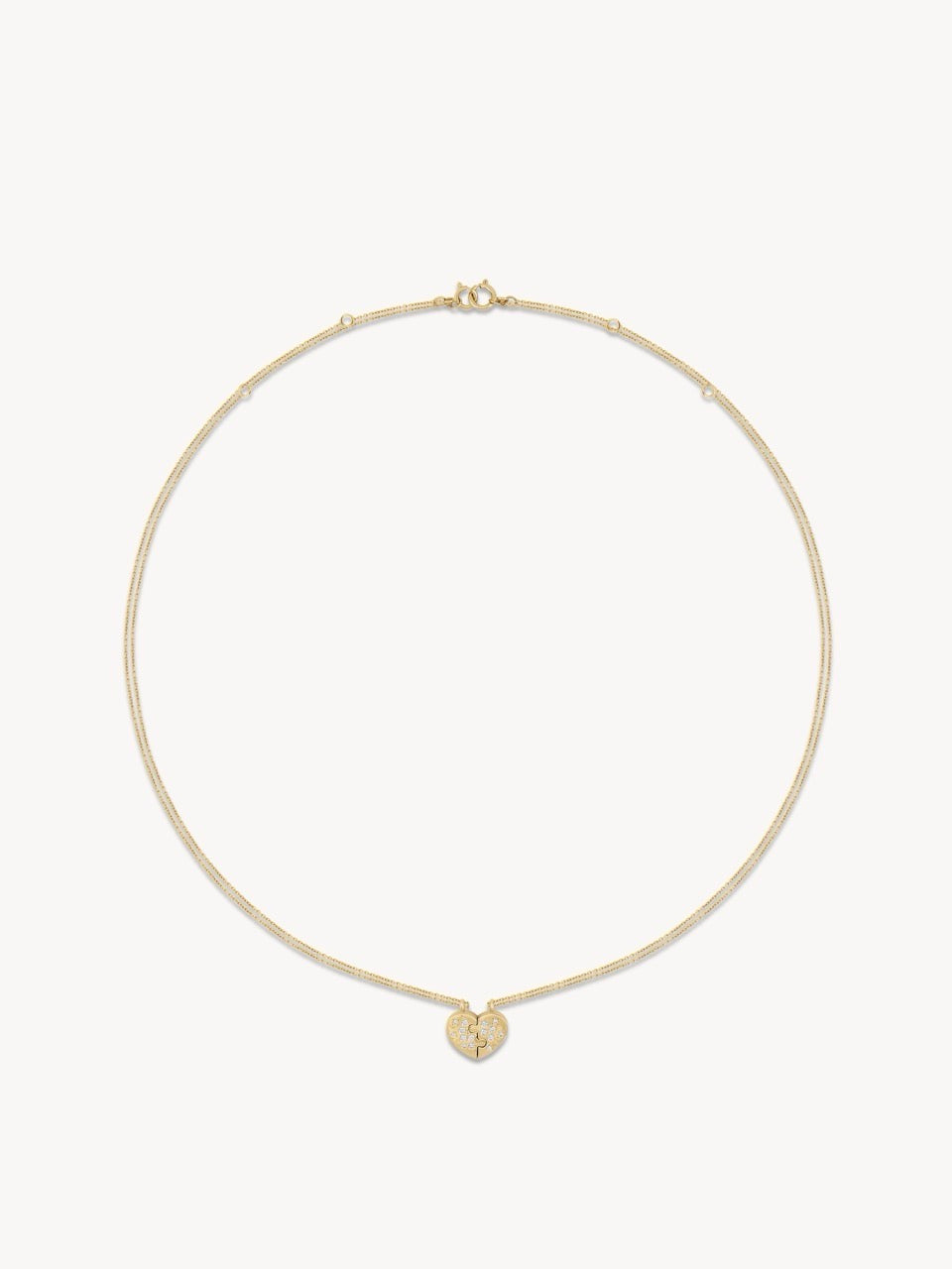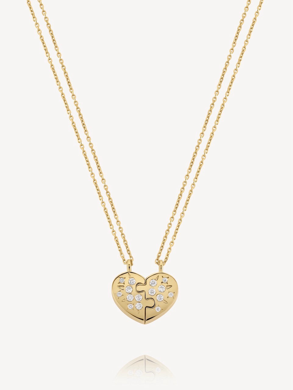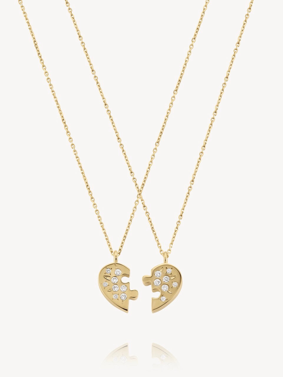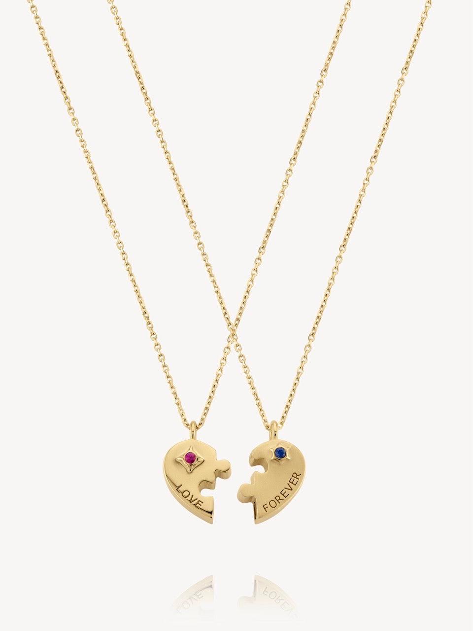 The Friendship Puzzled Heart Necklace celebrates connection with two halves coming together to form one whole. Crafted in 14k solid yellow gold and set with natural round white diamonds, this piece symbolizes the kind of friendship that fits effortlessly, even when apart. The back of each pendant is engraved with "Love" and "Forever" and accented with a single sapphire and ruby. Whether shared with someone special or worn as a daily reminder of love and unity, this necklace captures the beauty of bonds that last a lifetime.