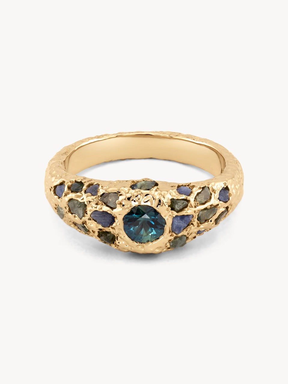 A reflection of Utah’s raw terrain, this ring embodies the connection between earth and light. Natural sapphire fragments glint from sculpted gold, creating a surface that feels unearthed rather than made. Each piece is individually shaped by hand on the West Coast, its texture and tone revealing the unique story of its creation.