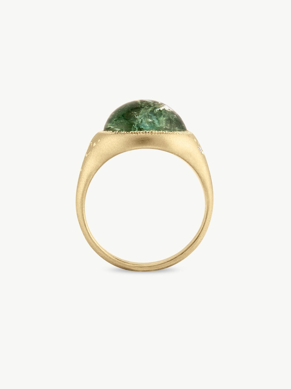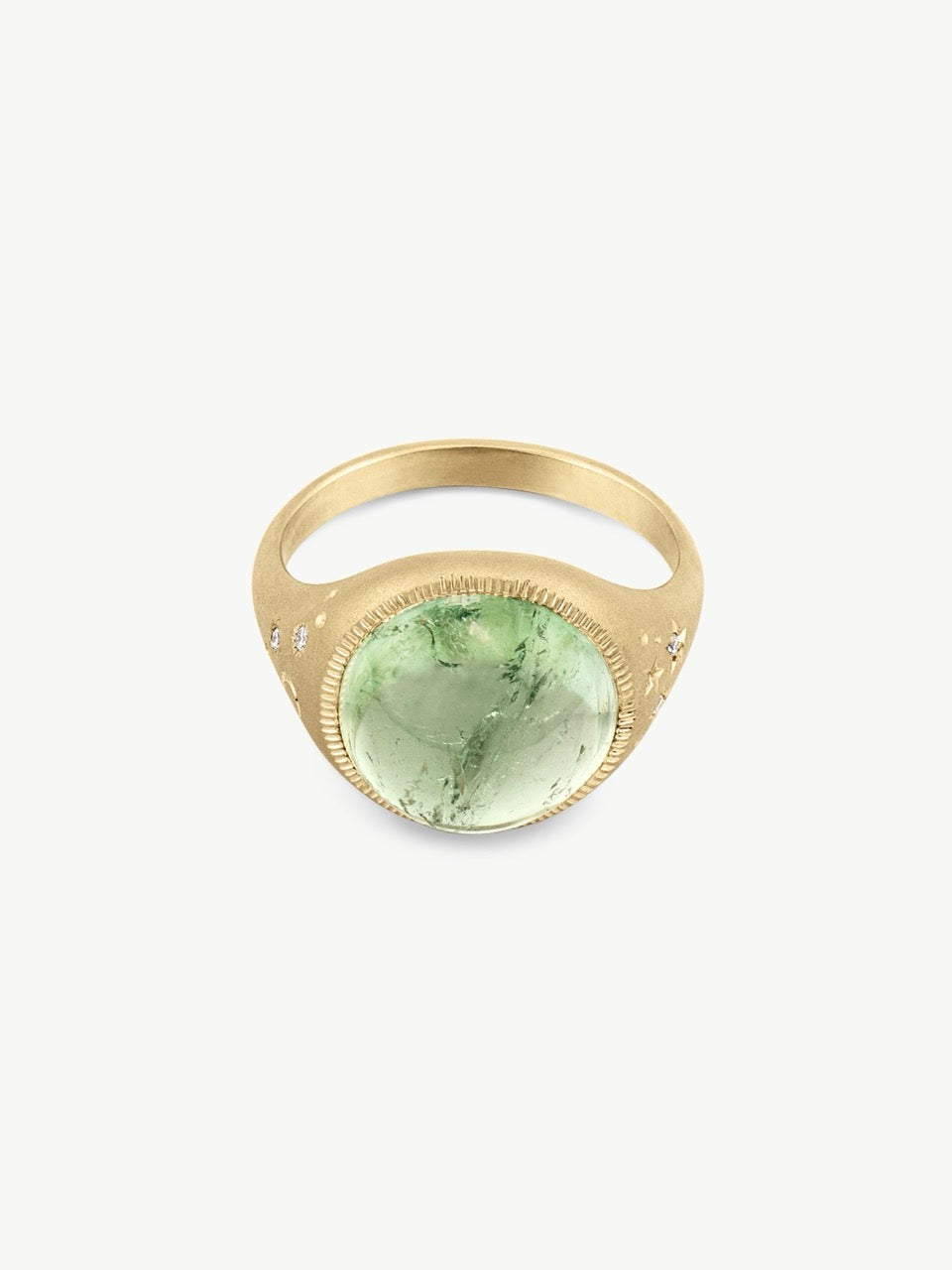 This one-of-a-kind Galileo Ring features a lighter teal Brazilian green tourmaline that shines with a calm, luminous energy. Hand-carved in Atlanta, Georgia, the ring curves smoothly around the stone, creating a soft sculptural silhouette that shifts beautifully in the light. Celestial engraving adds a gentle touch of texture while four petite diamonds offer a quiet shimmering detail. Designed to feel expressive yet easy to wear, it brings a fresh, bright moment of color to the hand.