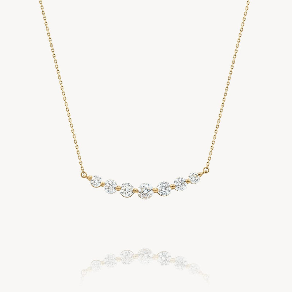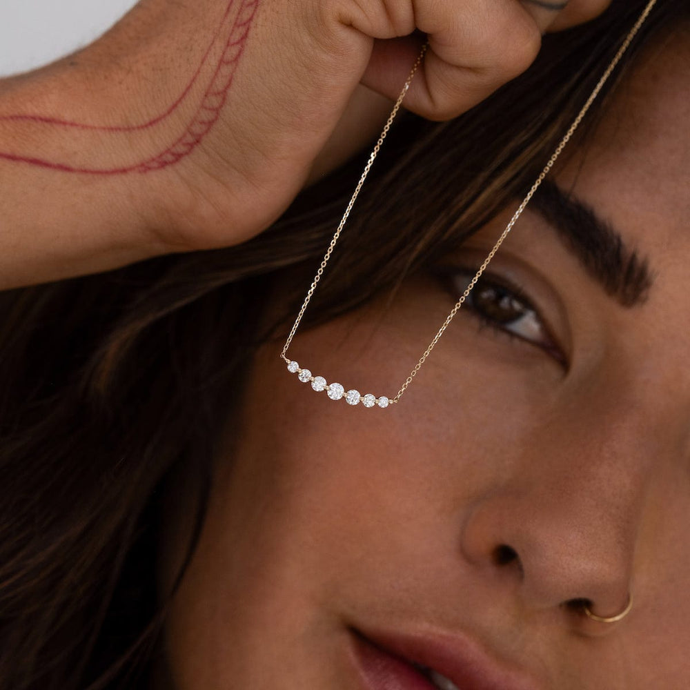 Like a delicate piece of Diamond lace floating against your collar, this charming necklace boasts a special sparkle! The Floating White Diamond Necklace features seven diamonds arranged on a curved bar. The diamonds vary in size, with the largest in the center. A showstopper that can be dressed up or down! Layer with any piece in your necklace collection or wear solo as your newest signature.
