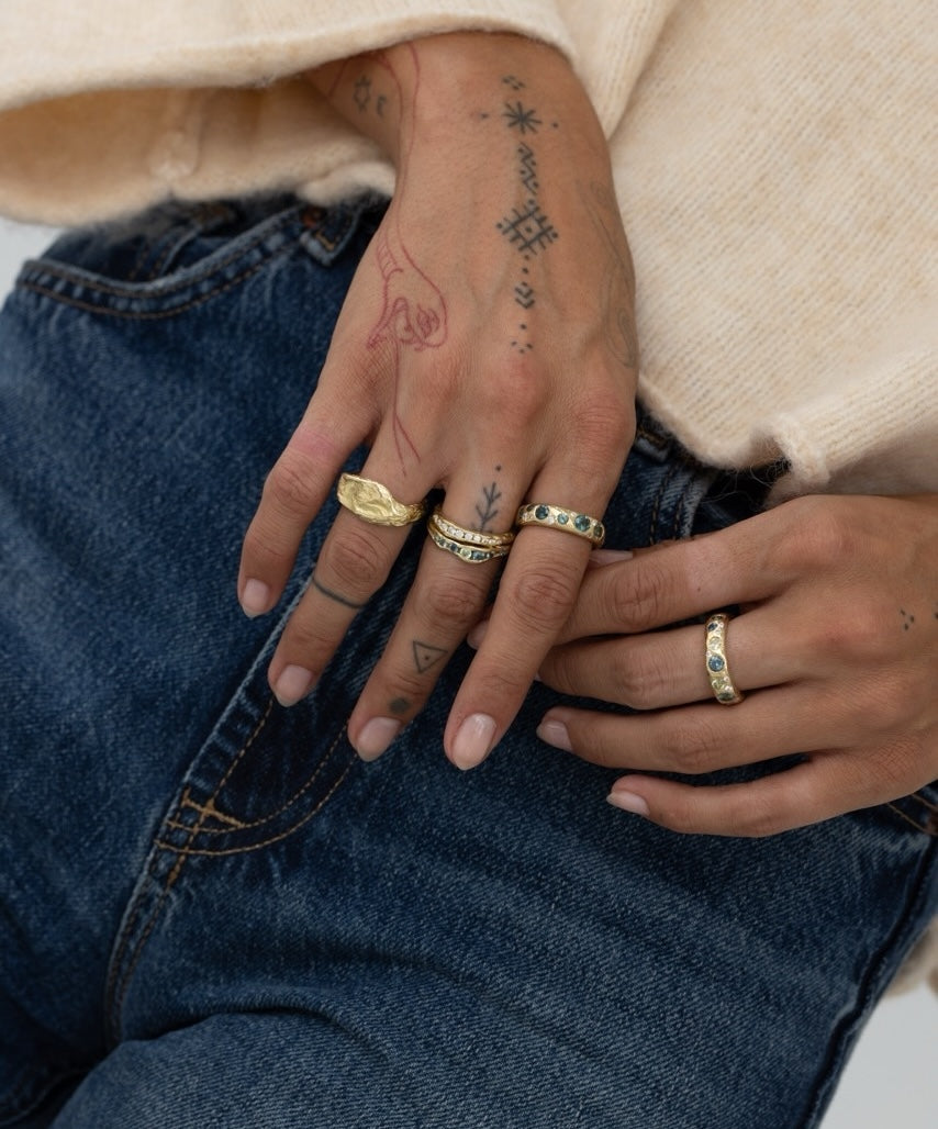 A stand alone statement encrusted ring. The smoothed, rocky gold embedded with pools of ocean blue and purple sapphires and brilliant diamonds is simply stunning. Crafted in 18k Matte Yellow Gold, a piece that is for sure to catch the eye.