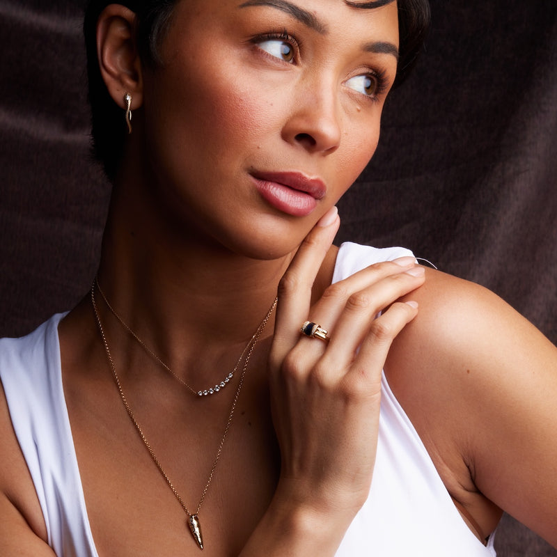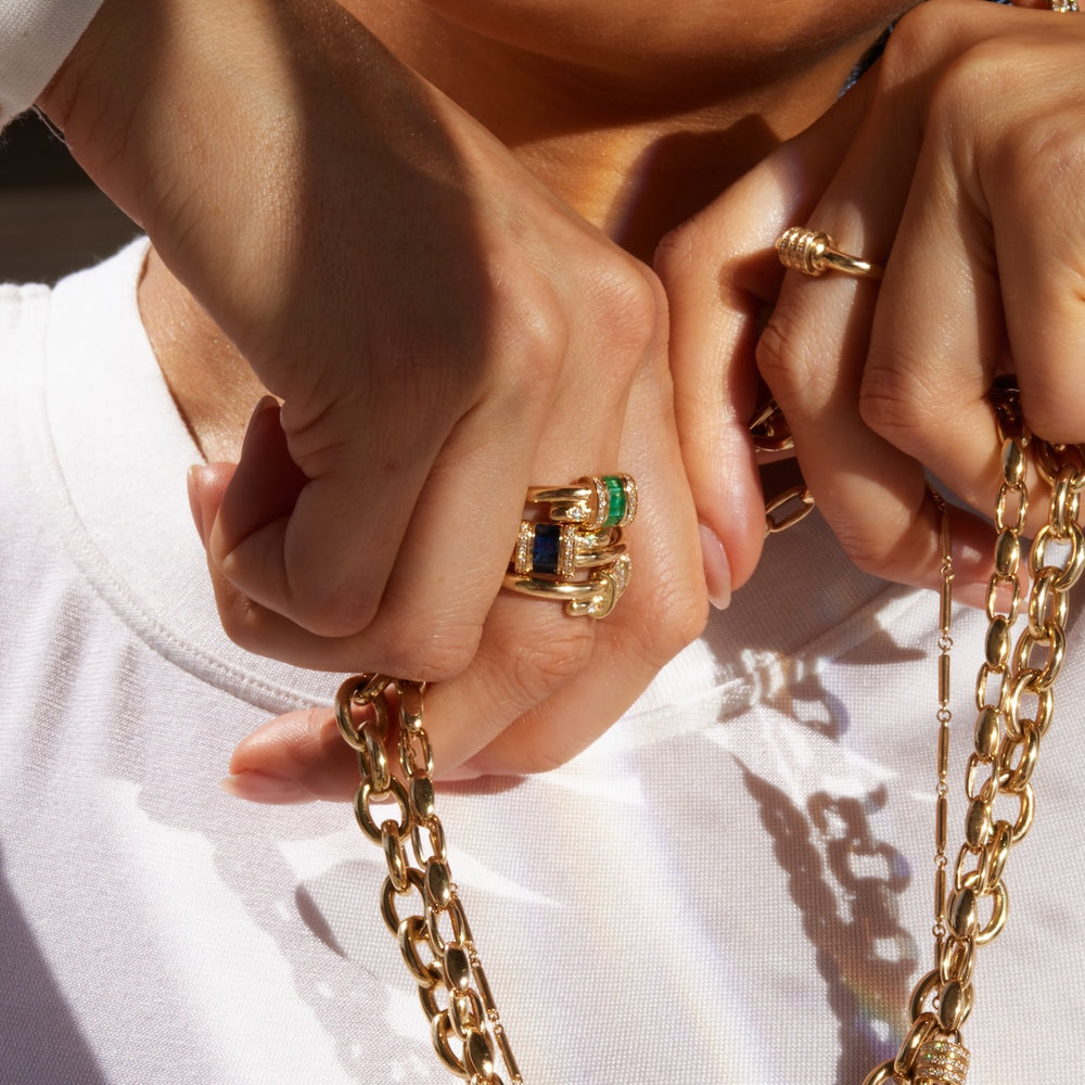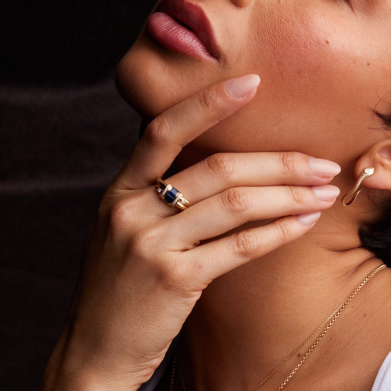 An elevated evolution of our signature latch design, the Vaulted Latch features a bold, sculptural silhouette. A row of center-set baguette stones adds a refined edge, making this piece as collectible as it is effortless.