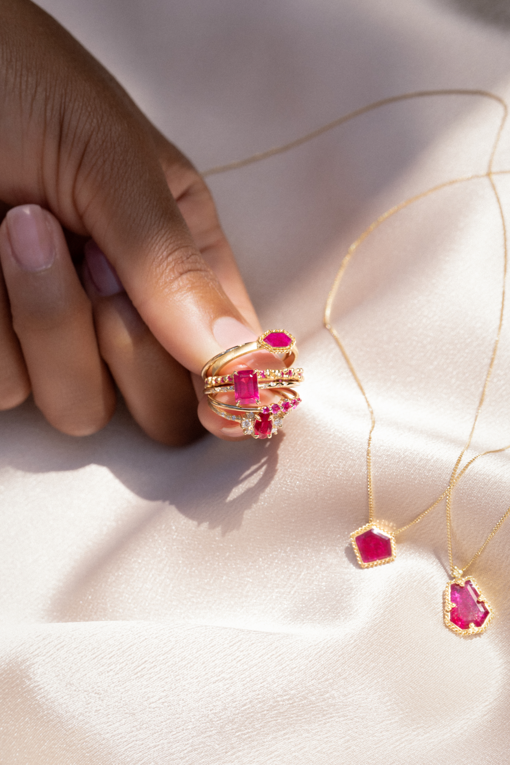 Rubies are one of our favorite stones to work with. The deep, rich color gives us a canvas to design truly memorable pieces. With their durability, second in hardness only to diamonds, these pieces will last forever, echoing the romanticism they emanate.