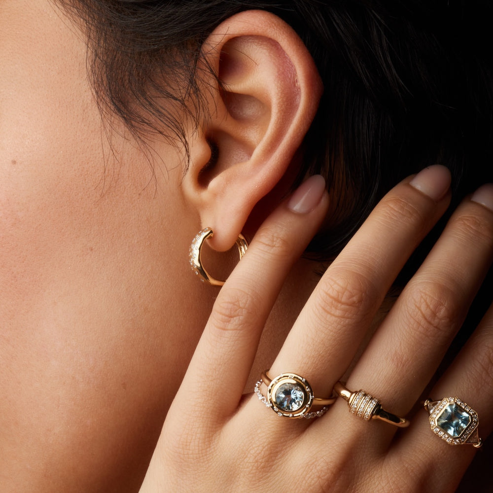 Brilliant-cut white diamonds are set in organic, yet refined forms, capturing a balance of raw beauty and timeless elegance.