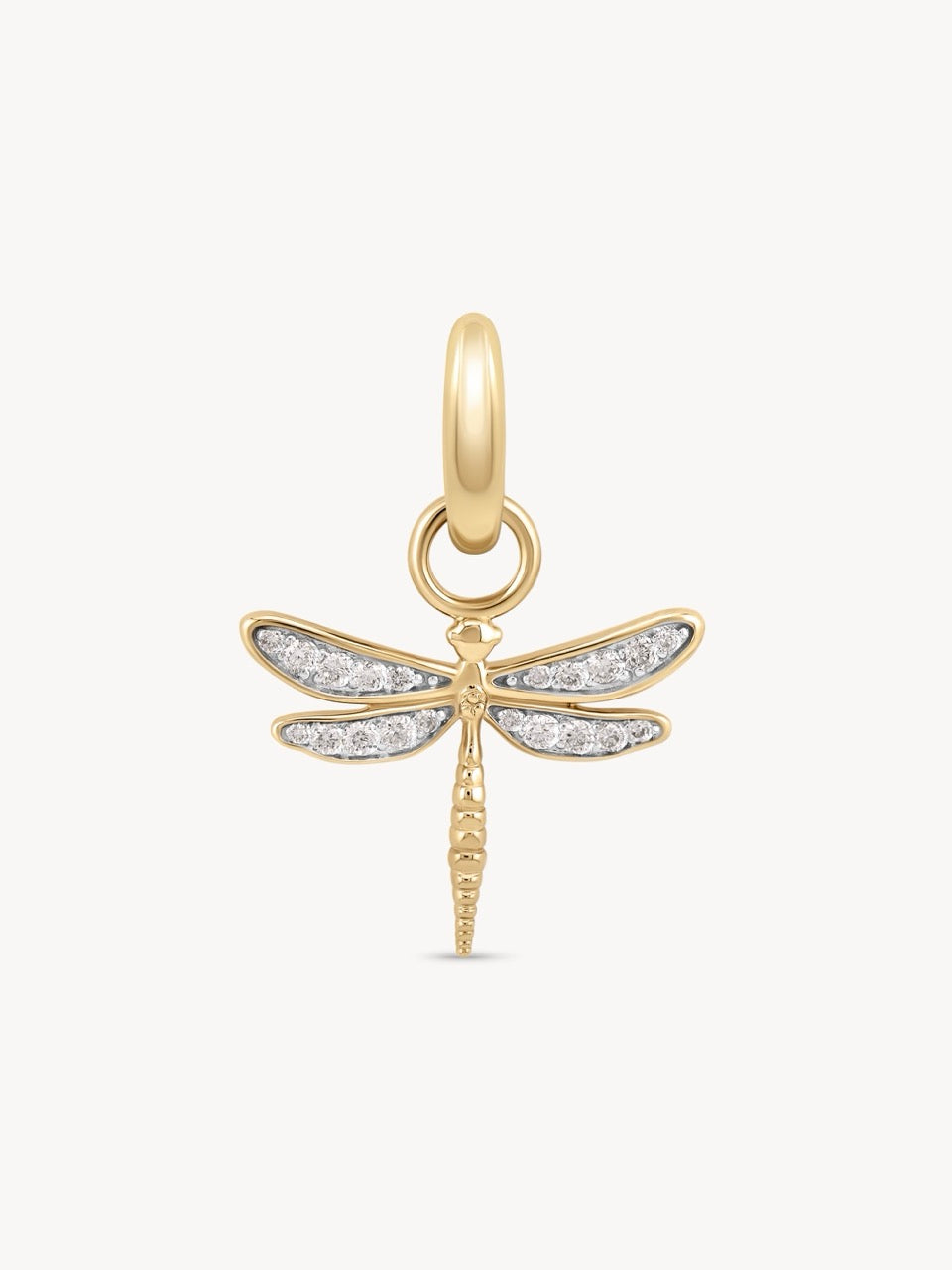 This charm captures the delicate beauty of one of nature's most elegant insects. Crafted in 14K yellow gold, it features wings adorned with pavé diamonds that catch the light beautifully with every movement. The intricate detailing showcases the dragonfly's distinctive silhouette, from its slender body to its shimmering wings.
