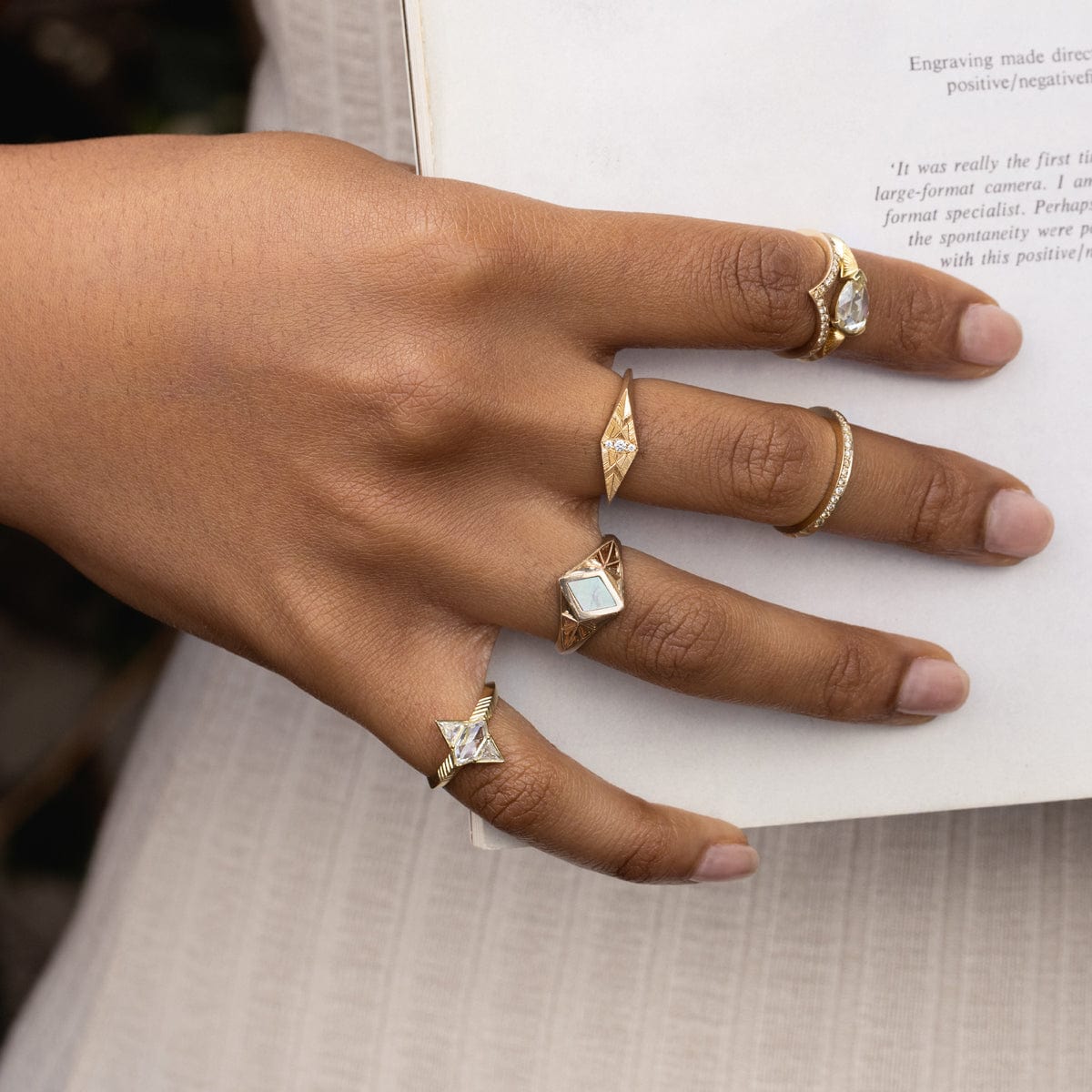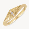 Ailuros - the Greek name for the Egyptian feline goddess Bastet, known to rule over the home, domesticity, fertility and childbirth. Delicate whiskers of bright hand engraved cuts surround three tapered Diamonds in the form of brilliant cat eye.‚ This is a ring of quiet wisdom, secrets, and connection to the astral realms.‚