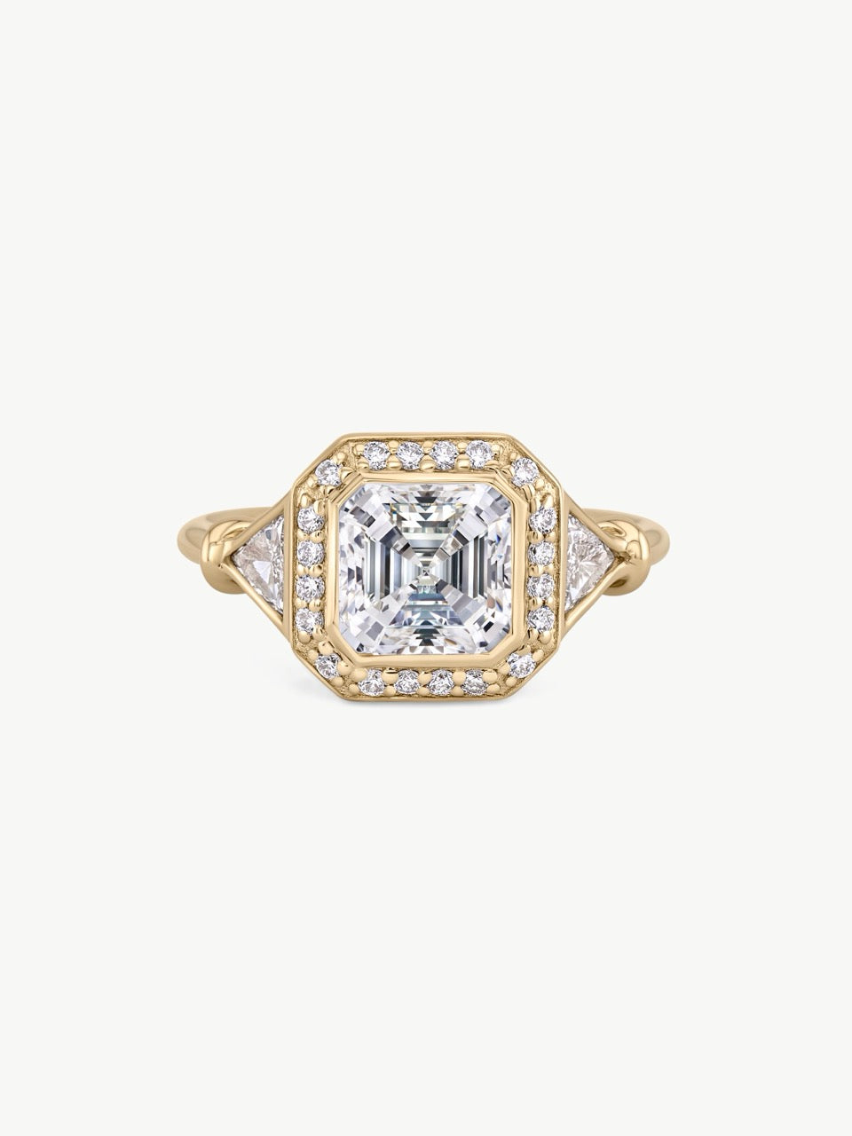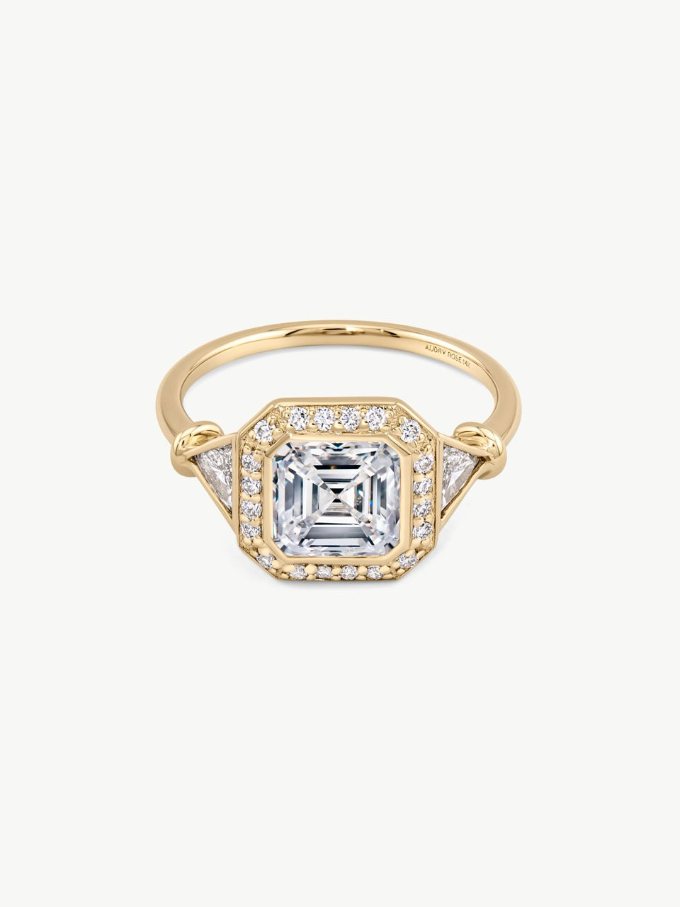 Crafted in 14K solid yellow gold, the Lucy Diamond Ring is centered with a VS+ white diamond framed by a precise halo of white diamonds. The angular silhouette of the setting gives the ring a strong architectural presence, while the diamond detailing along the shoulders adds depth and dimension from every angle. This is a substantial, statement piece defined by structure, clarity, and deliberate design.