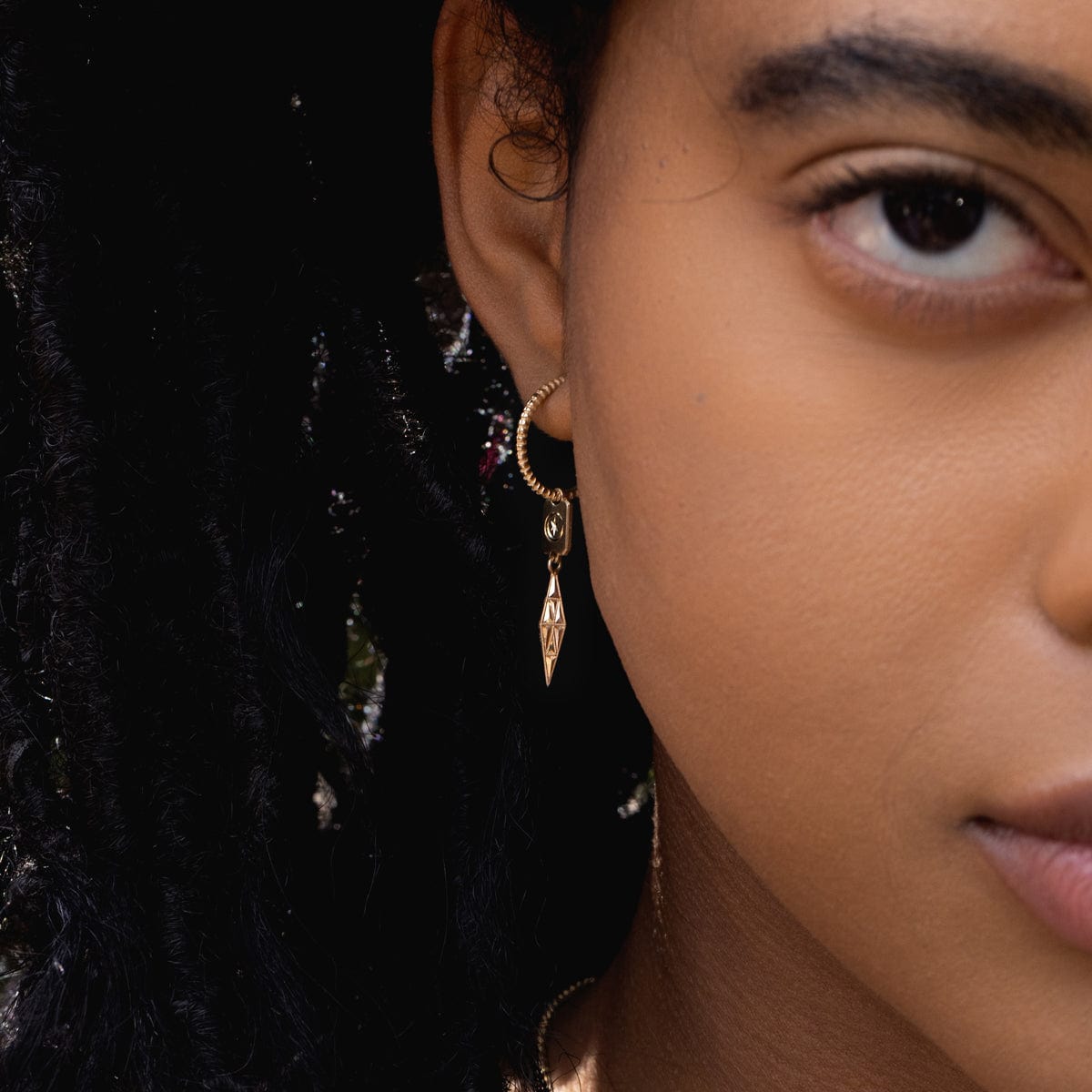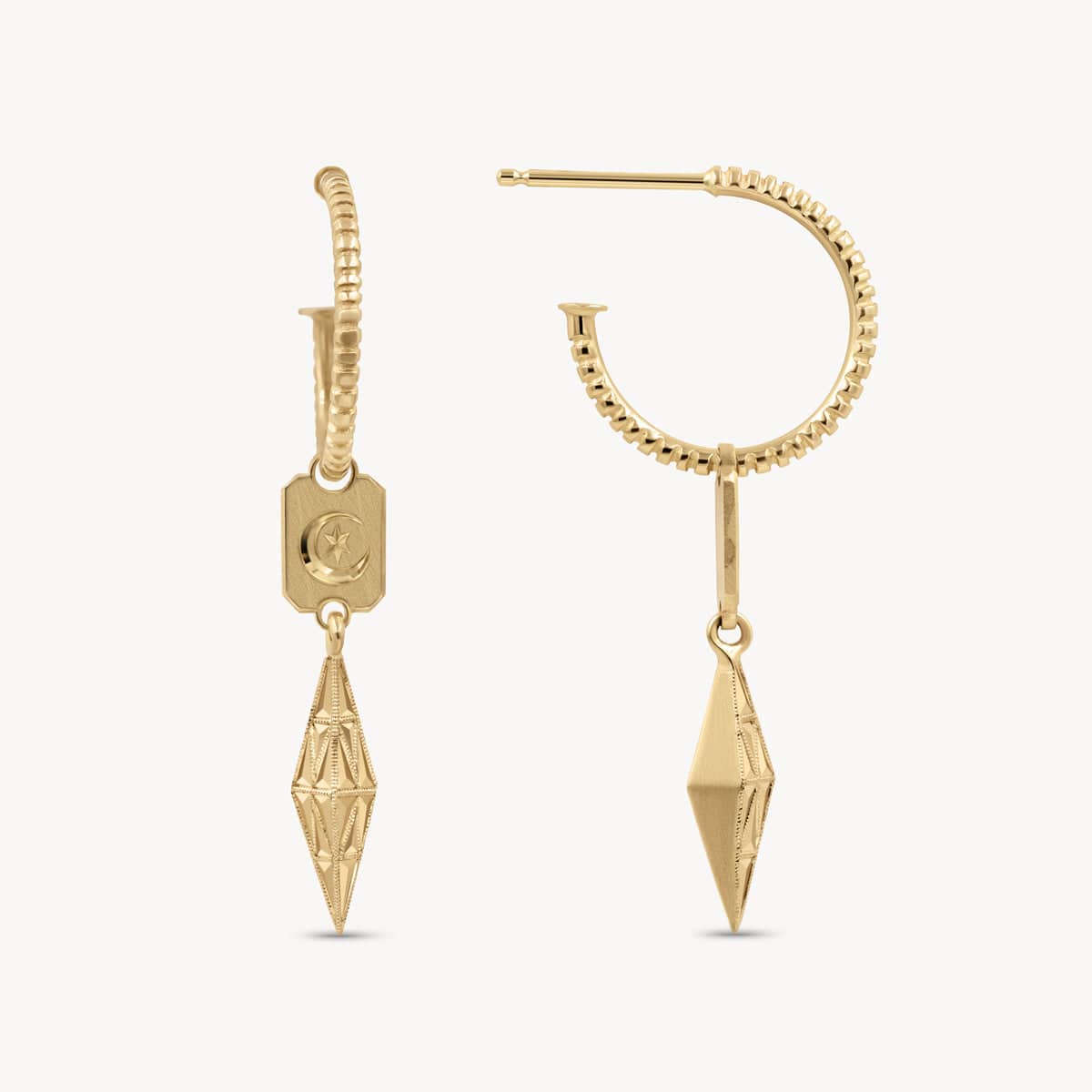 A magical‚hand engraved moon and star gleam above a geometric obelisk with delicate milgrain details, all suspended from a beautifully reflective hoop of delicate notches. These unique earrings tap into the creativity and wisdom of dreams, and dazzle from every angle.