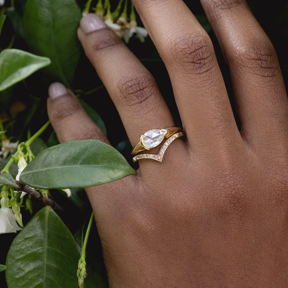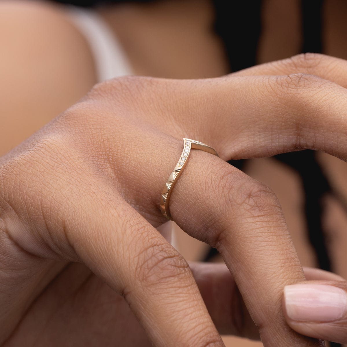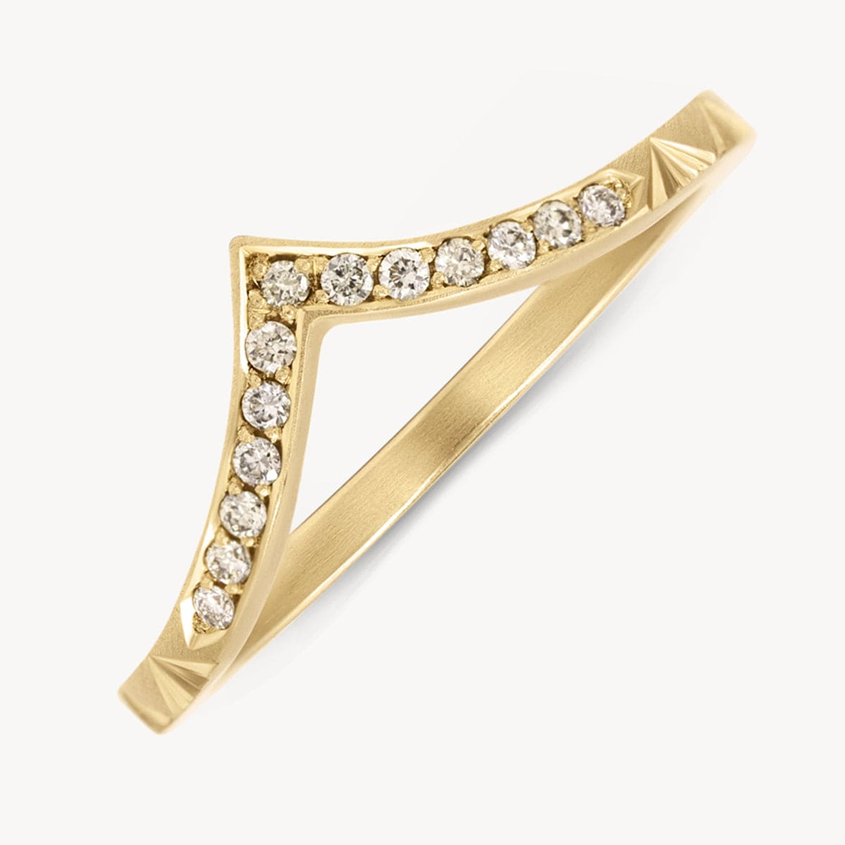 The perfect delicate yet sturdy V shaped stacker or wedding band! ‚An elegant mix of half champagne Diamond pave sparkle and half deco inspired hand engraved detailing.