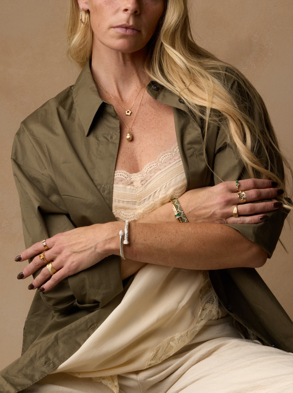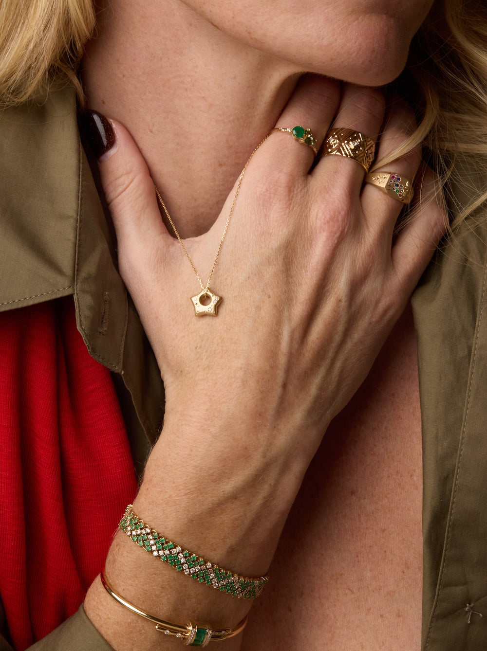 Inspired by vintage ’80s puff jewelry, the Starr Puff Charm brings a soft, rounded glow to any chain. Hand-carved in Atlanta, Georgia, it features a smooth, puffed silhouette with a center opening that serves as the jumping-off point, creating an airy, open feel. Celestial engravings add gentle texture while natural diamonds offer a subtle shimmer across the surface. Designed to feel playful, polished, and easy to wear, it layers seamlessly and adds a warm, expressive touch to any collection.