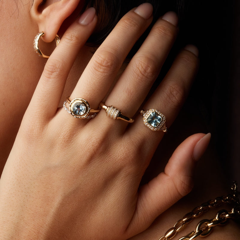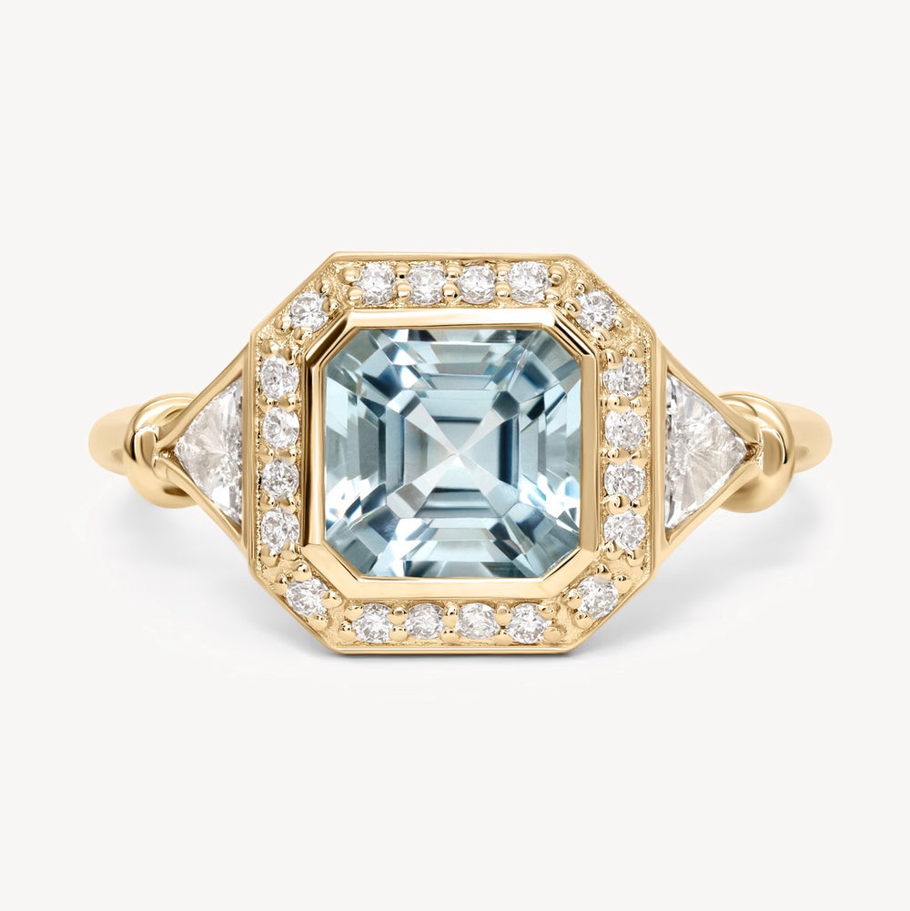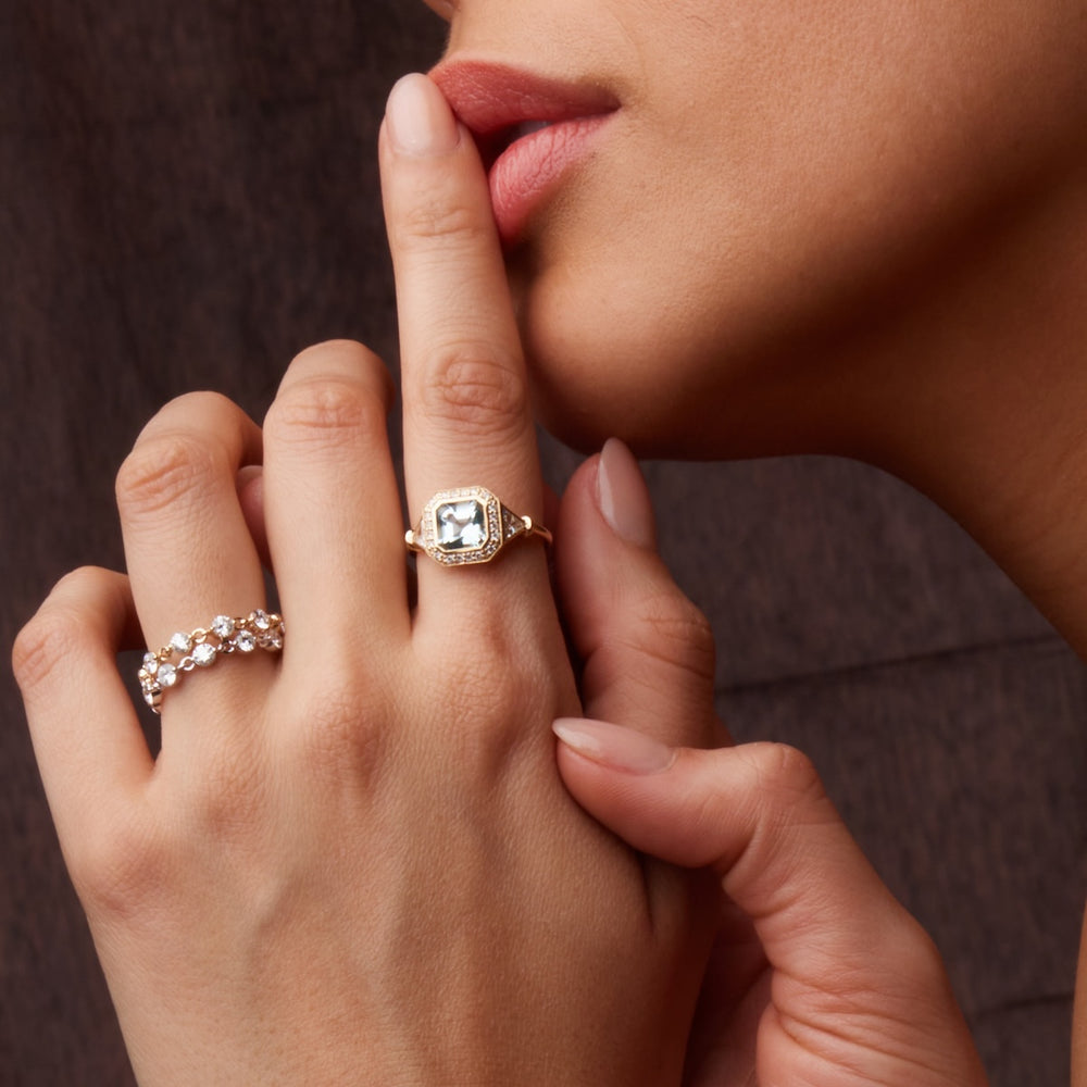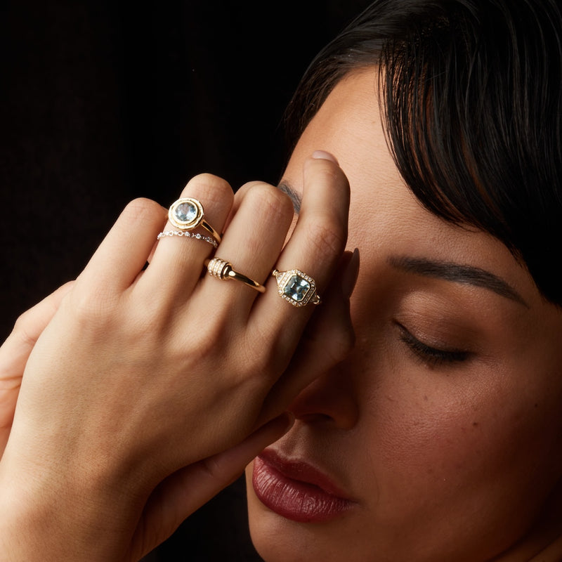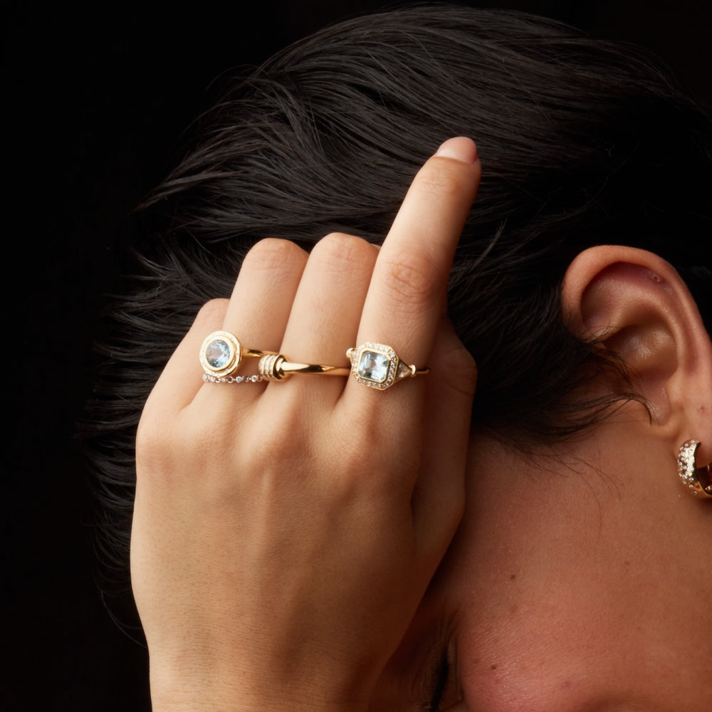 This ring showcases a stunning Aquamarine stone that symbolizes tranquility, clarity, and protection.
