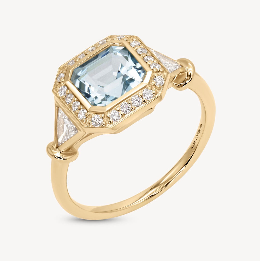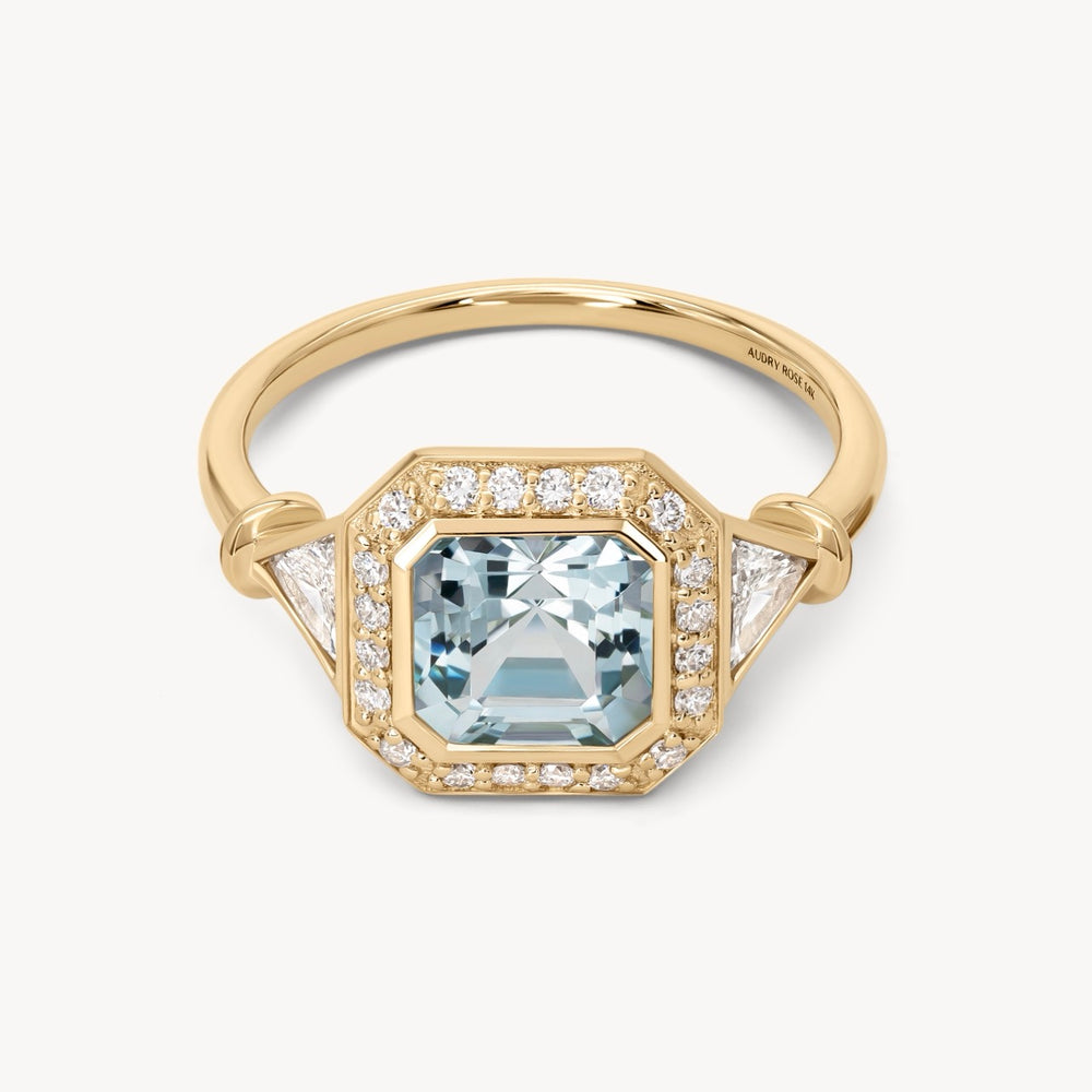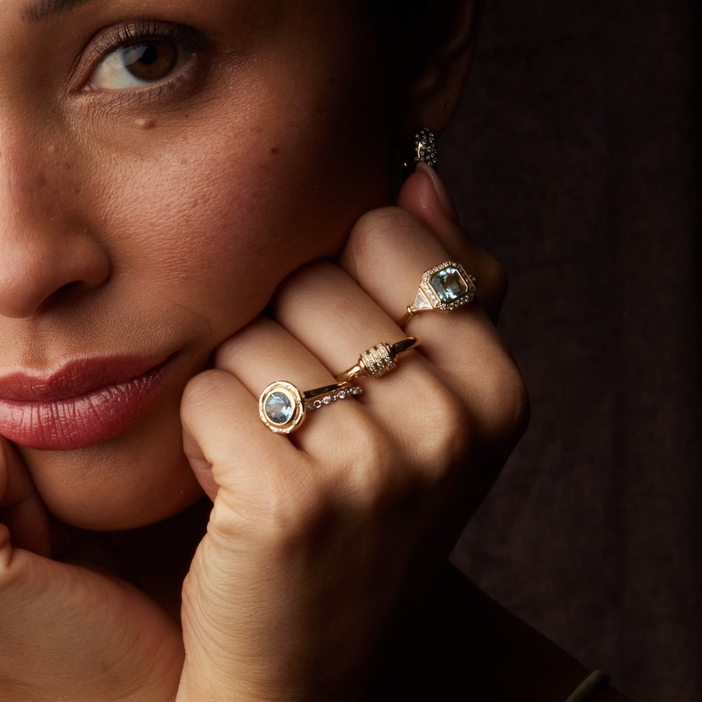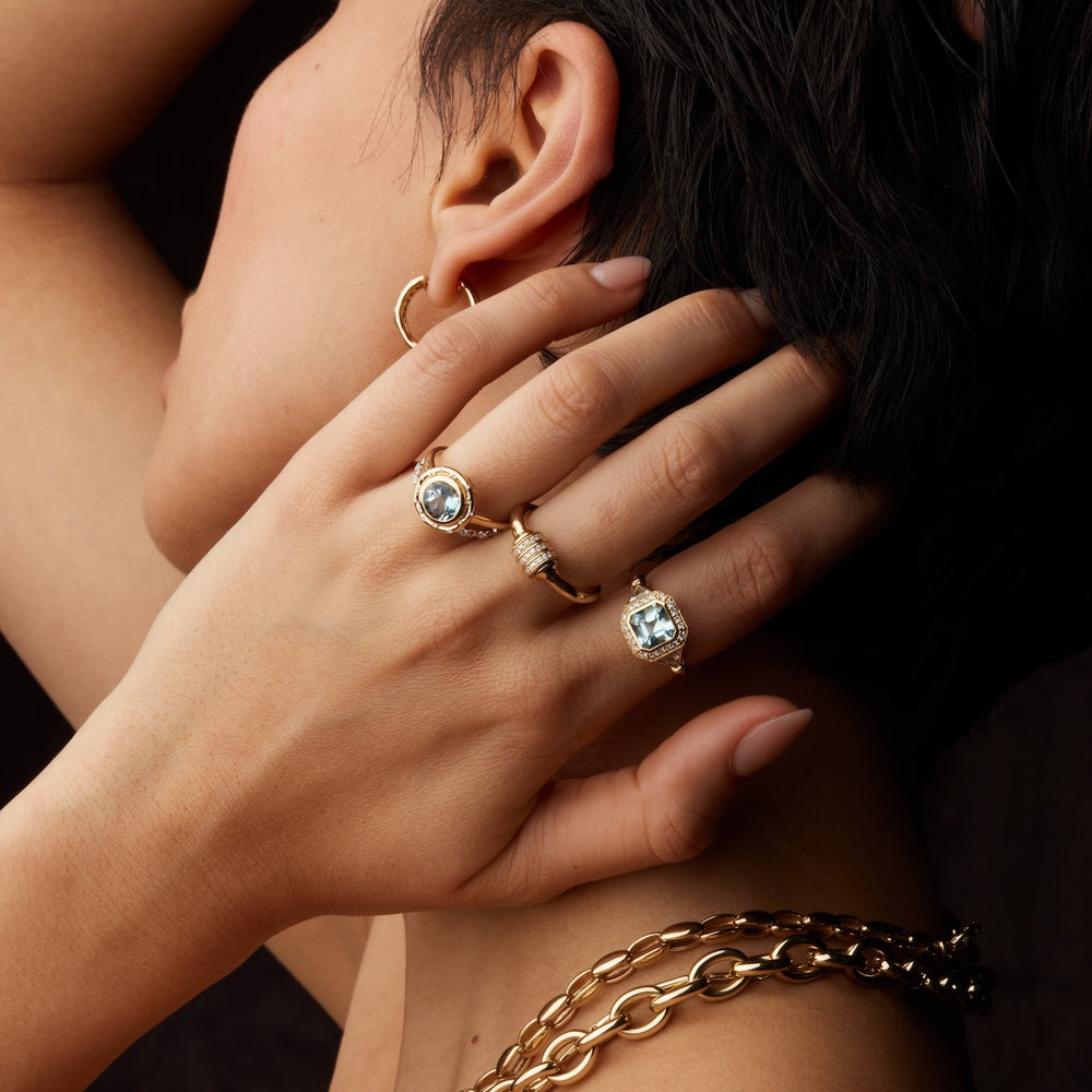 This ring showcases a stunning Aquamarine stone that symbolizes tranquility, clarity, and protection.