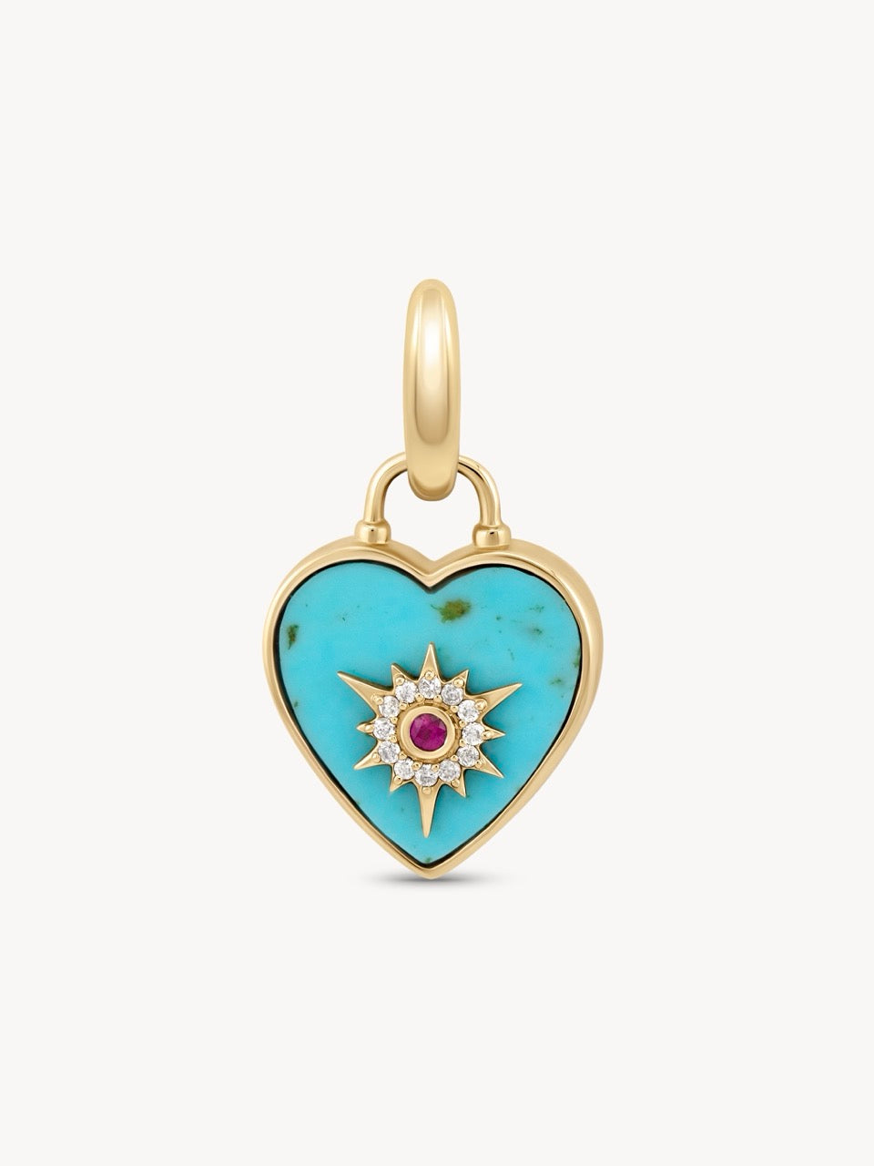14k Yellow Gold Charm with Natural Diamonds, Turquoise, and Ruby.
