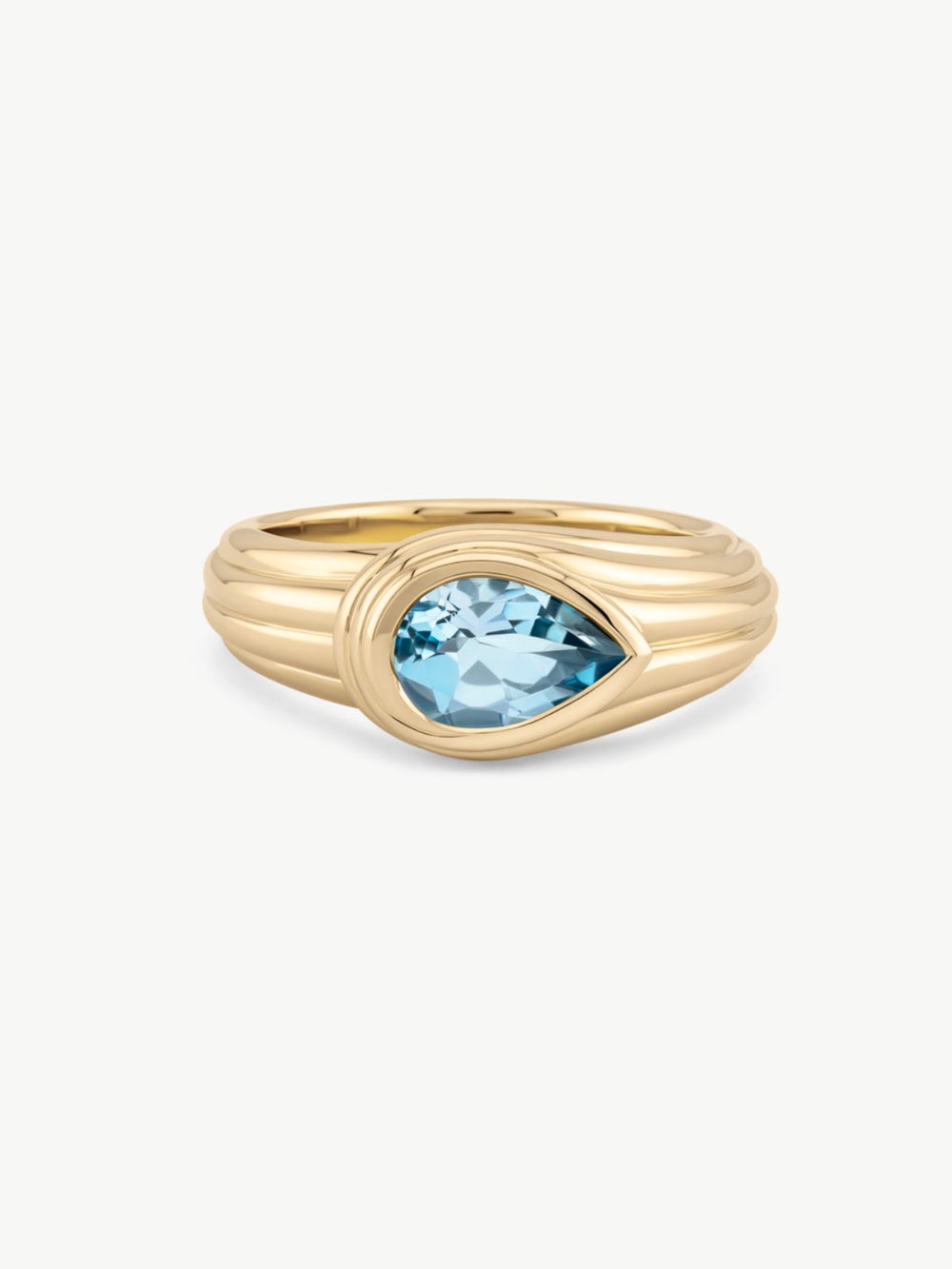We choose high quality blue topaz for its clarity and natural depth. The color is a clear, light blue that stays consistent across the stone. Set in solid 14K gold, the gold is shaped directly around the stone, creating a defined edge that gives the ring its structure. The band is built with soft ridges that taper as they move toward the stone, adding weight without feeling bulky. The stone sits low in the setting, keeping the profile close to the finger.