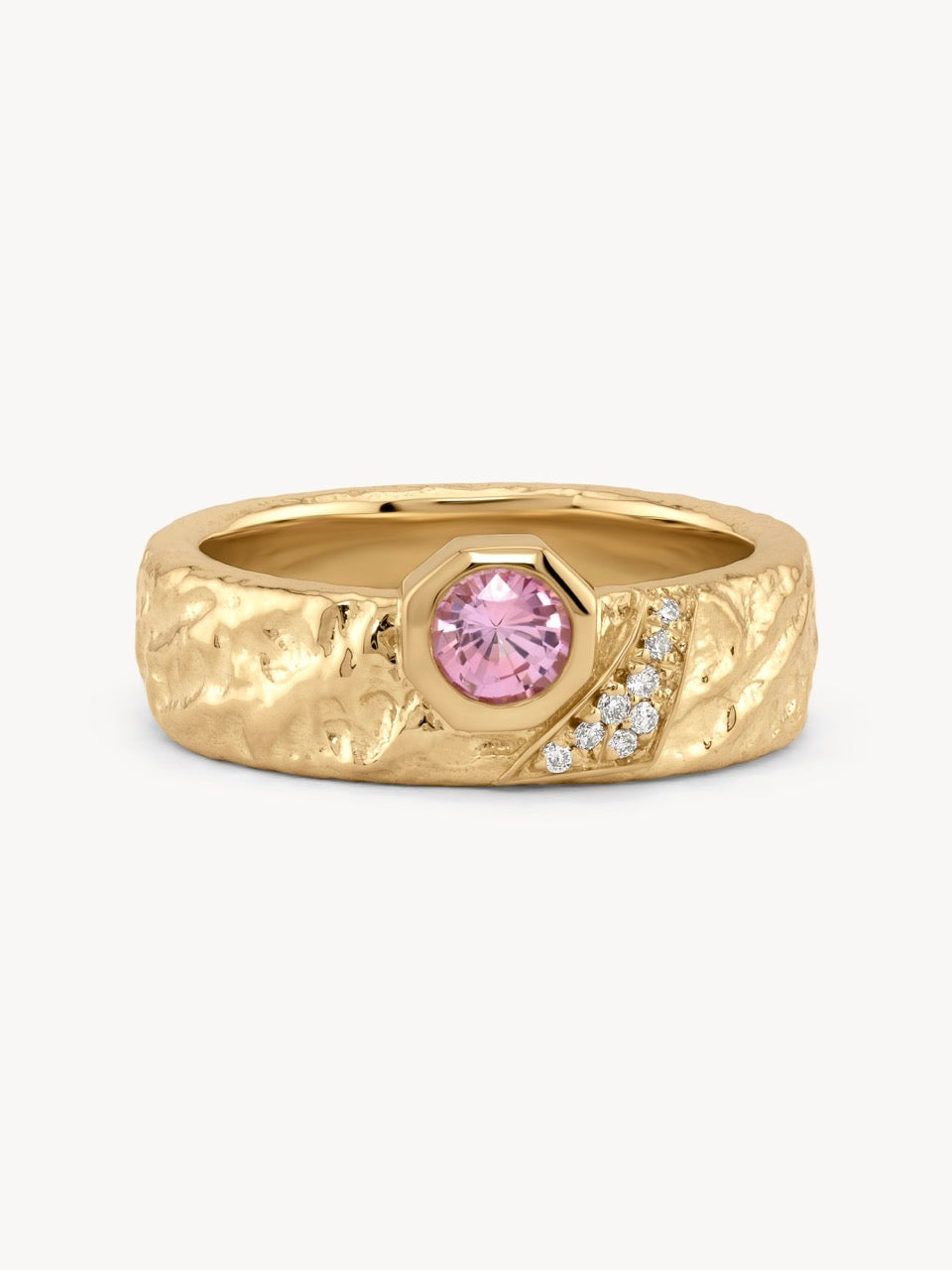 Shaped in tribute to Utah’s rugged landscape, this ring blends strength and softness in sculpted gold. The pink sapphire catches light like the last glow of a desert sunset, framed by an organically textured band. Every ring is hand-carved on the West Coast, created individually to highlight the balance between natural irregularity and refined craftsmanship.