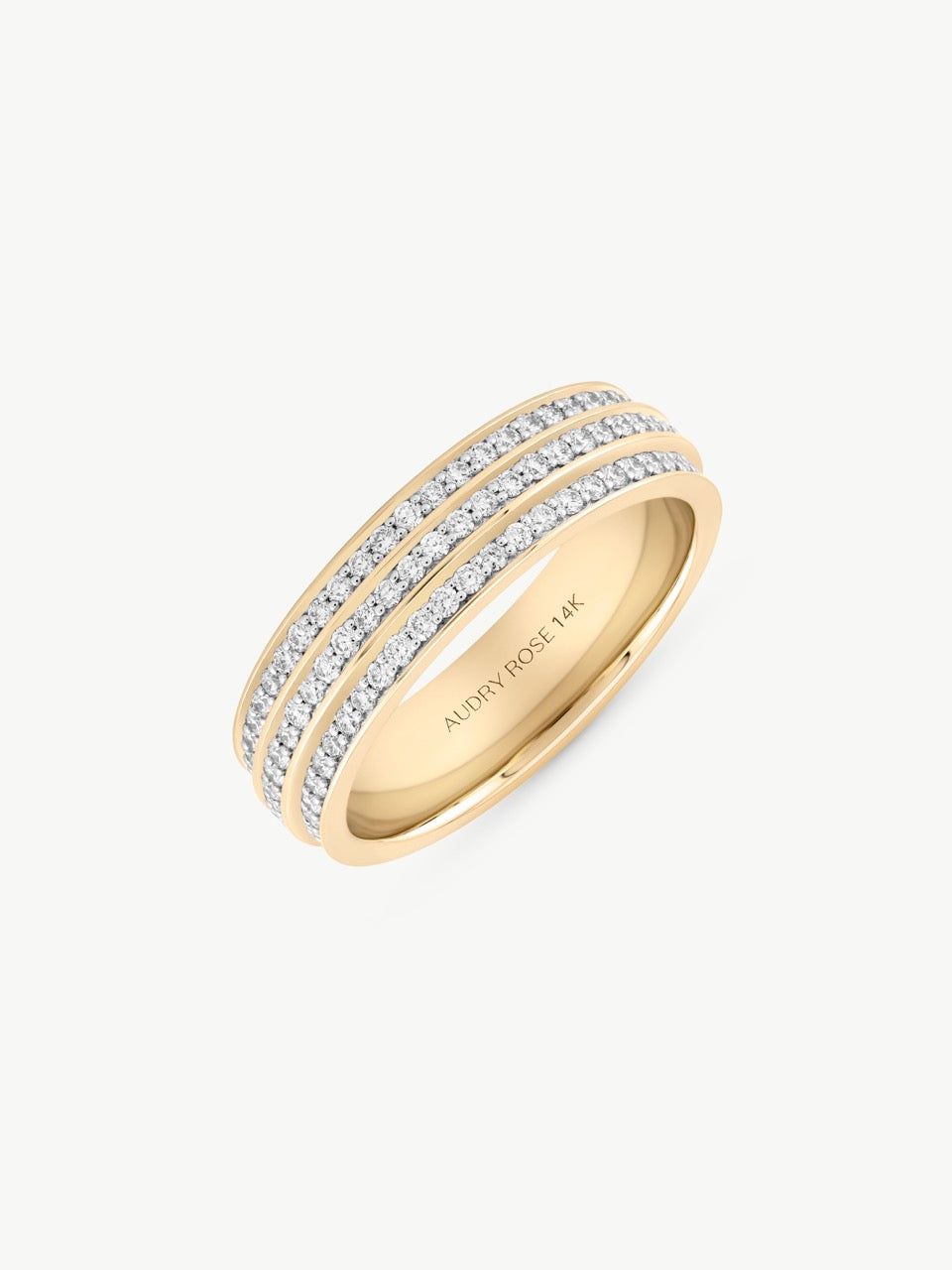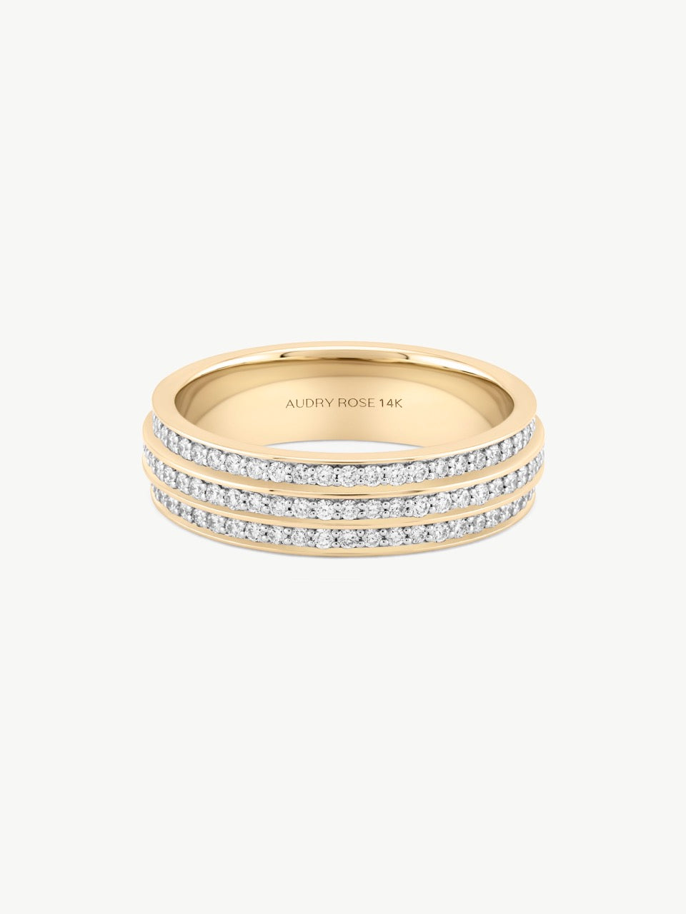 Crafted in 14k yellow gold, the Diamond Tiered Eternity Band features three rows of pavé-set white diamonds that wrap seamlessly around the finger. Its tiered profile and continuous sparkle give this band a bold yet timeless presence.