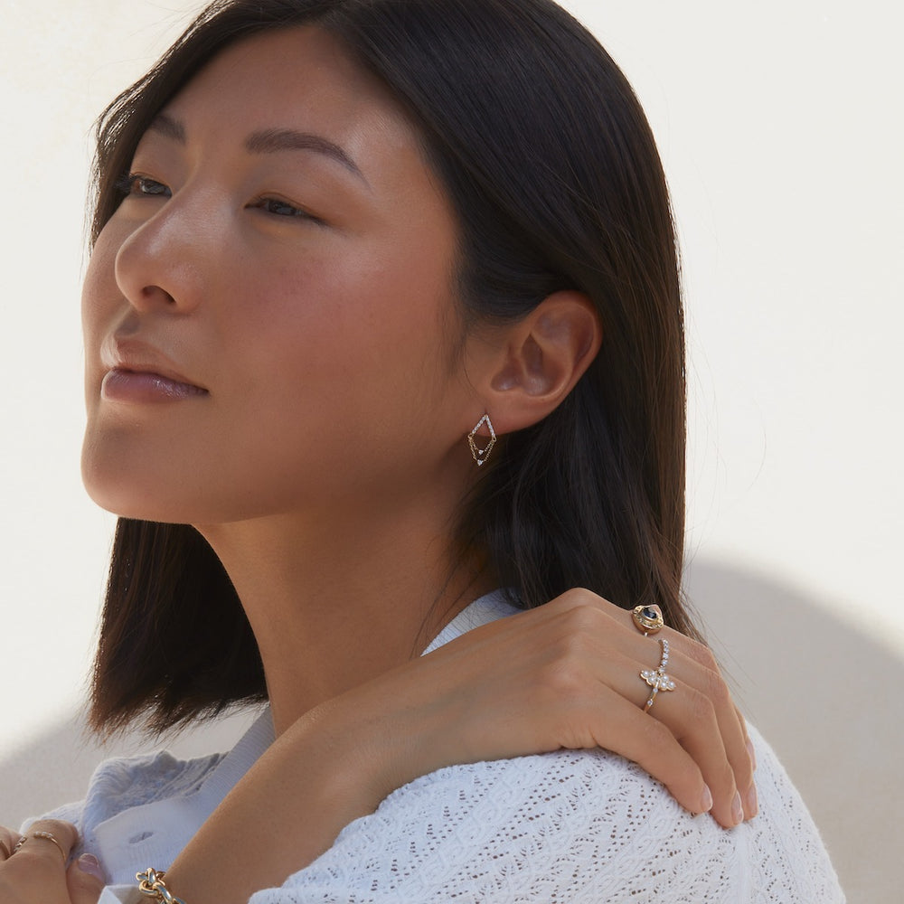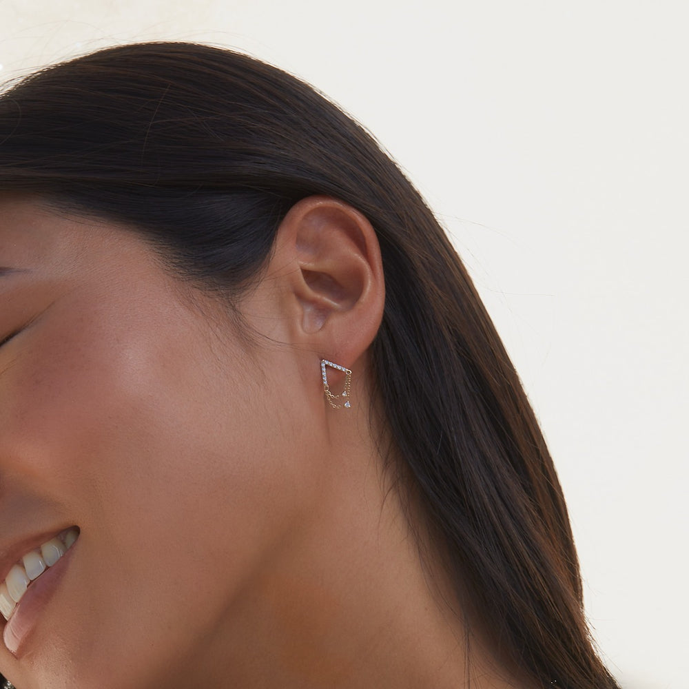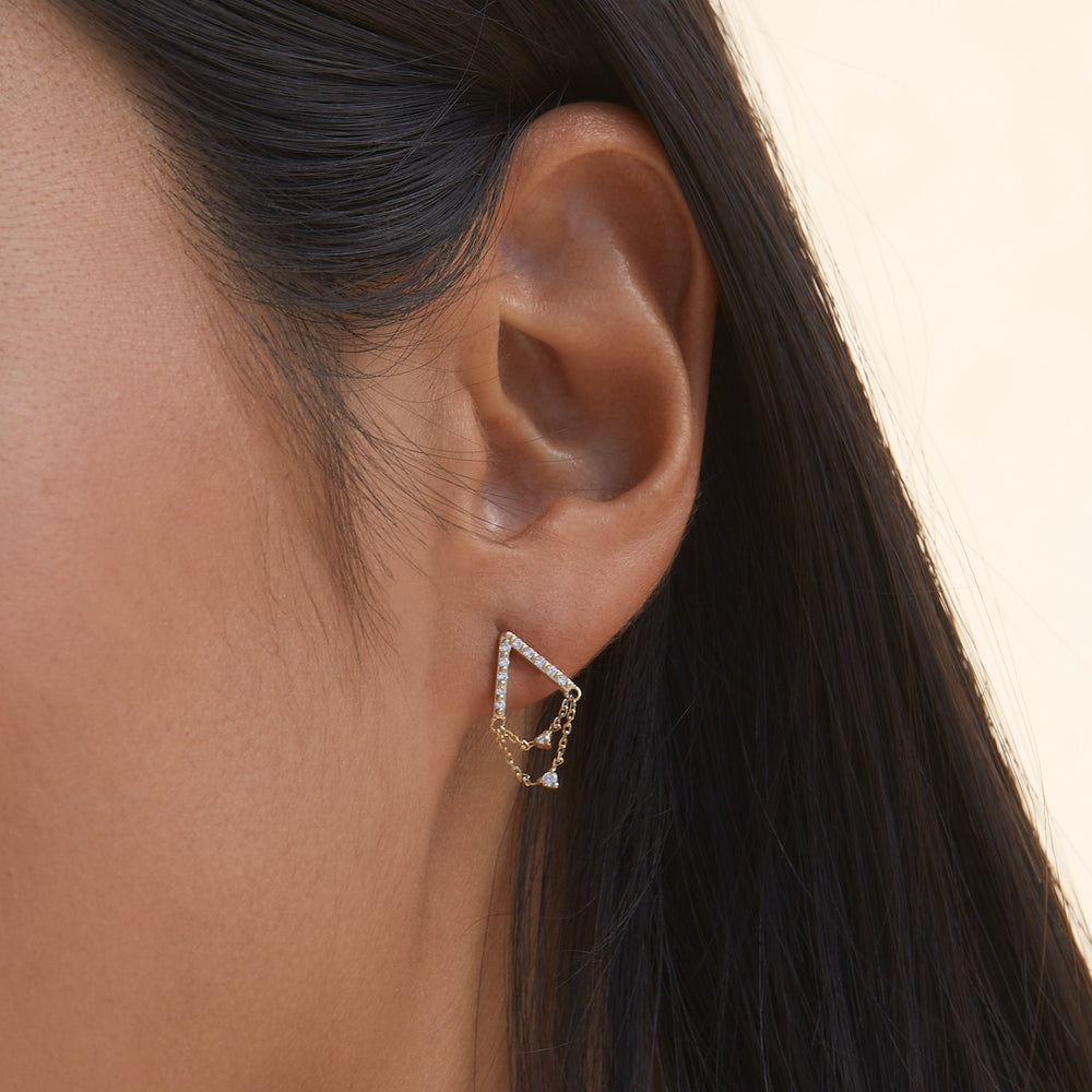 Featuring a sparkling pave-set A-frame stud that catches the light from every angle. Cascading down are two delicate chains adorned with shimmering diamonds that meet in the center, creating a mesmerizing visual flow.