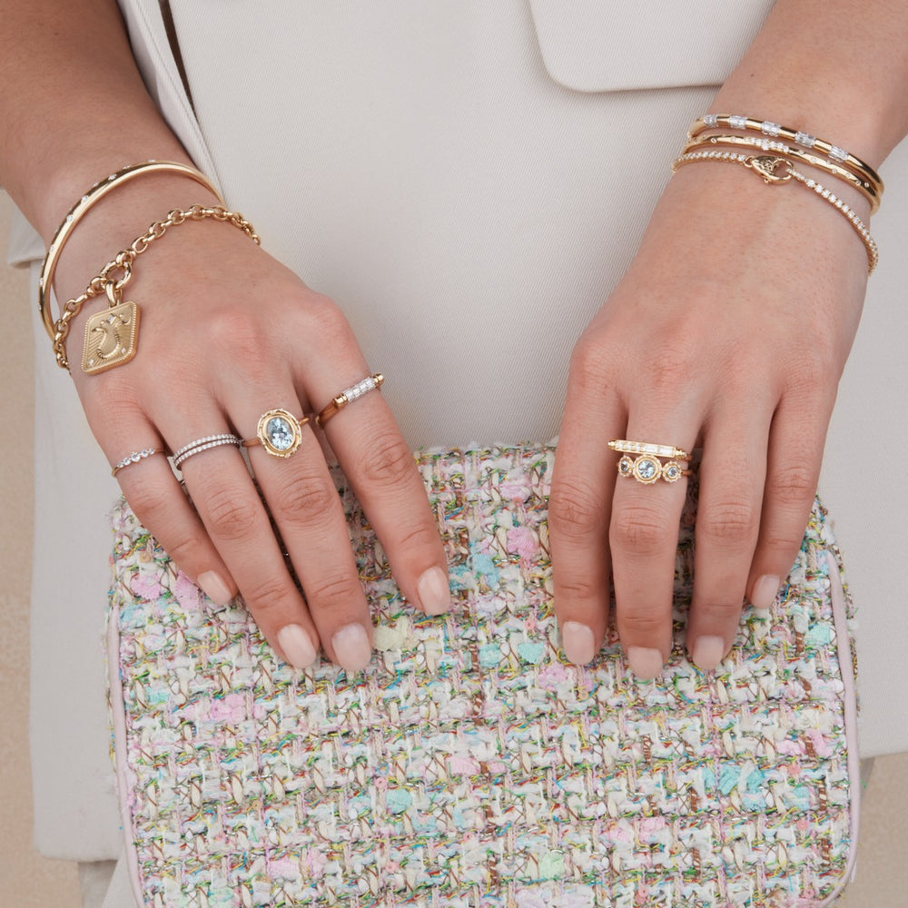 Building on one of our most loved designs, the Spotlight. This necklace introduces a subtle yet striking pop of color with the tranquil, icy blue of aquamarine, surrounded by our signature starry Diamonds. The serene hue of this stone breathes new life, capturing a timeless spirit with a fresh, modern edge.