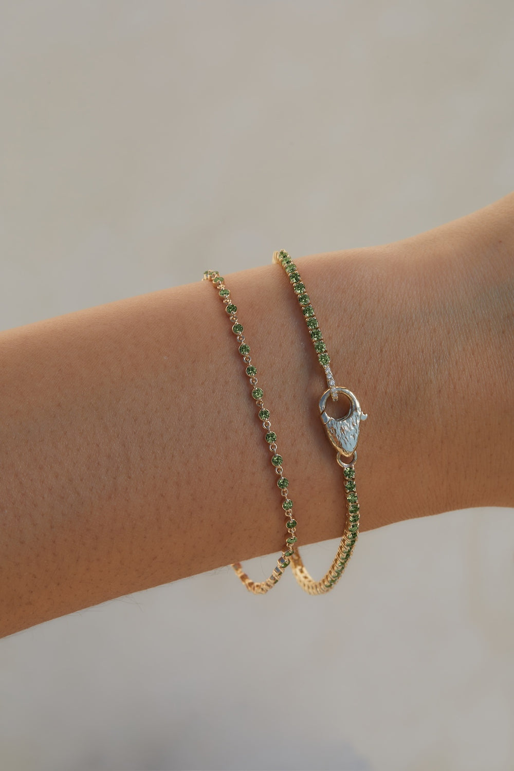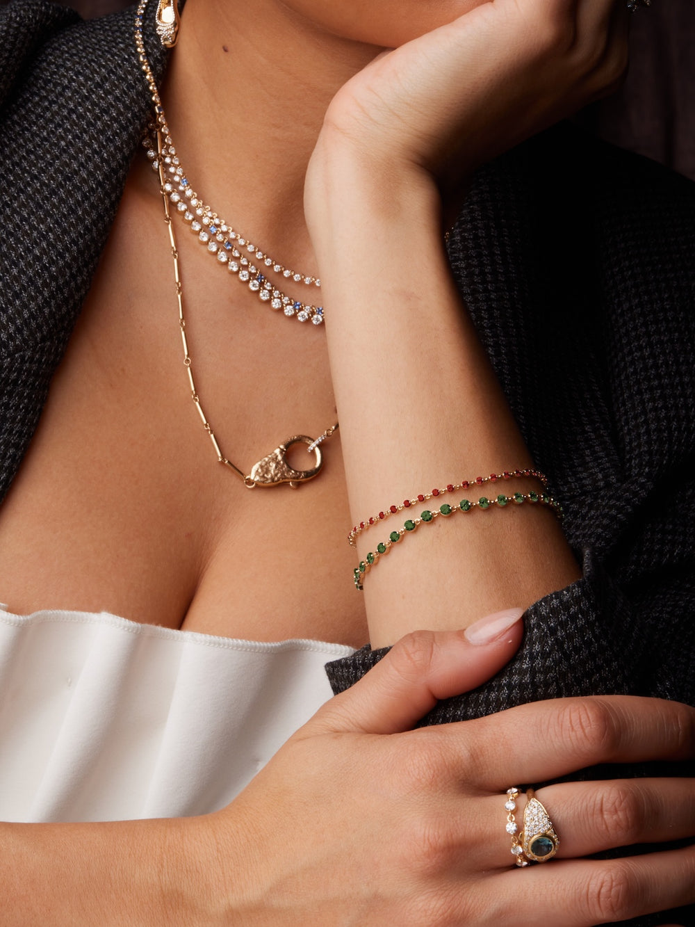 Not your average green, it’s moody, earthy, and cool. This bracelet lines up a row of rich green tourmalines, each bezel-set in buttery 14k gold for a look that whispers luxury but still winks at fun. It’s sleek enough to wear to a boardroom meeting and sparkly enough to tag along to cocktails afterward.