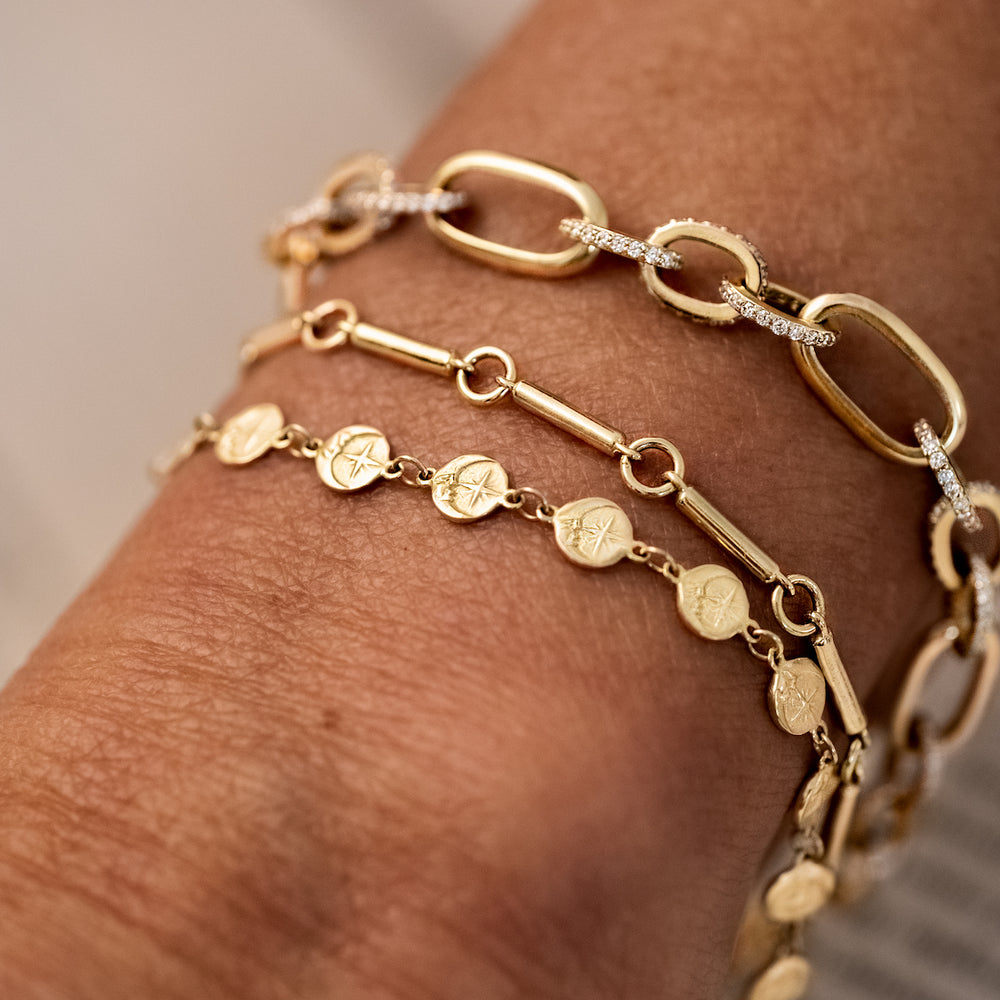 This classic chain bracelet was named after our founder Jaclyn's daughter, Sloan! A vintage chain style often worn as a charm bracelet, Jaclyn was looking for the perfect chain to pass her charm collection on to Sloan one day. Enjoy this timeless piece as is, or add a few of your favorite charms!