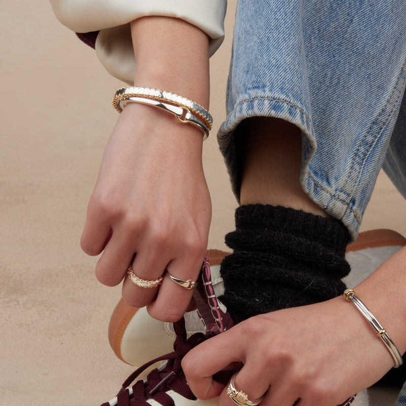 Each piece is designed to be collected, layered, and worn effortlessly—a nod to the way jewelry was once treasured and passed down. A true way to elevate everyday moments, whether worn alone or layered in a perfectly imperfect mix of metals.