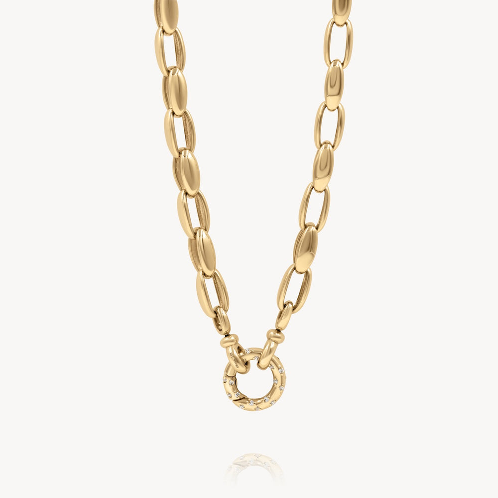 This necklace is designed to complement a wide range of styles! You get the best of both worlds with this piece as it features multiple ways to style on the front and back. You can wear charms and pendants on the small Aria Clasp side or add a substantial sparkle to your collar with the spinning Latch Diamonds on the other side.