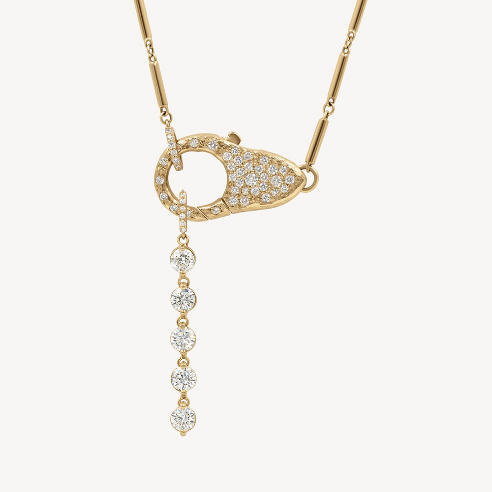 Two of our favorite designs in one. The lock was obsessively perfected after Jaclyn spent six hours side by side with a jeweler, carving, refining, and fine tuning every curve until it felt just right. The result is a yellow gold statement drenched in pavé diamonds that knows exactly how to steal the spotlight. The lariat adds a flirty finish, originally designed as a birthday gift for Jaclyn’s mom, because the best pieces always come with a story (and a little drama). Wear it layered. Wear it solo. Wear it like you mean it.
