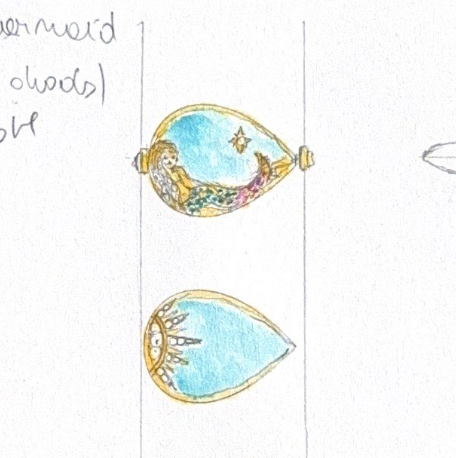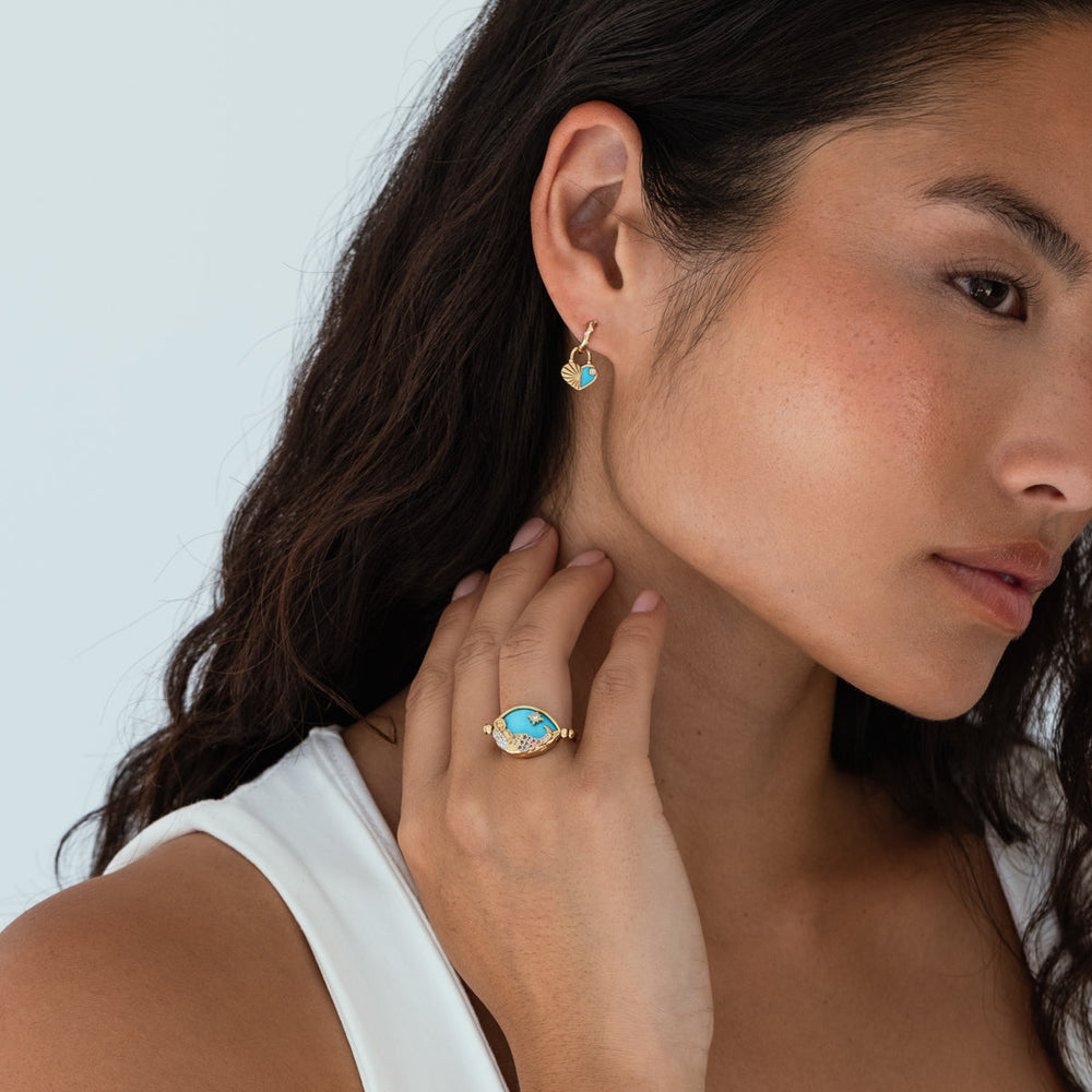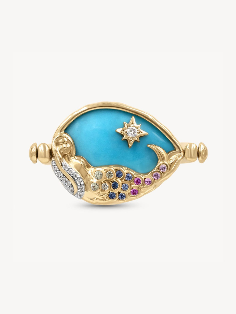 The enchanting Lover Flip Ring features on one side a mermaid, whose tail is adorned with colorful natural sapphires, basking in turquoise waters and illuminated by the sparkle of a diamond-set star. On the reverse, a vast turquoise pool is lit by a half sunburst, with diamond-encrusted beams casting radiant light.