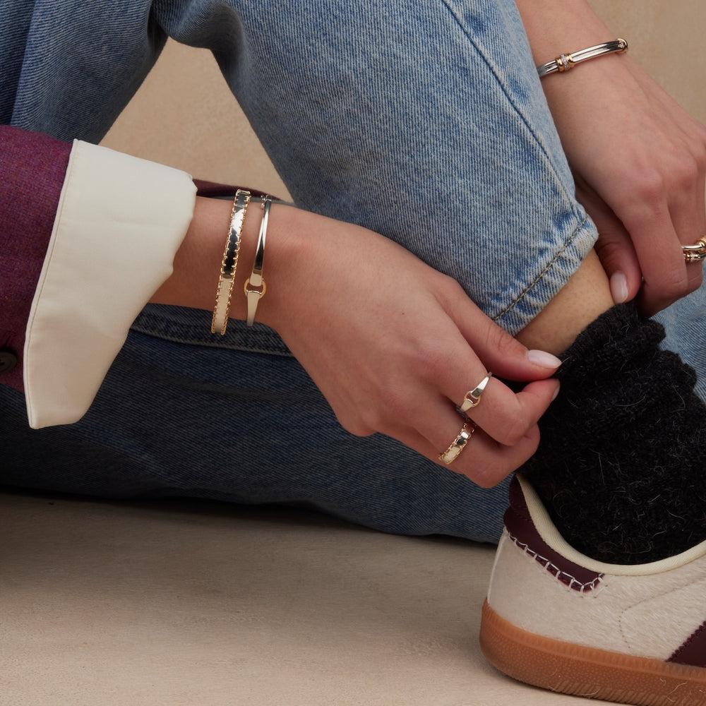 Each piece is designed to be collected, layered, and worn effortlessly—a nod to the way jewelry was once treasured and passed down. A true way to elevate everyday moments, whether worn alone or layered in a perfectly imperfect mix of metals.