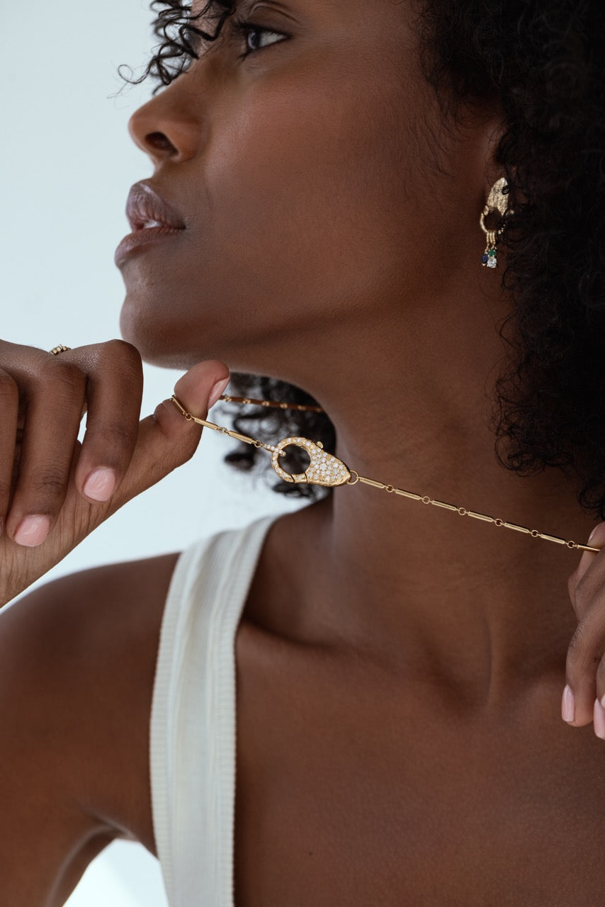 An evolution of the iconic original lock necklace that sets a new standard in luxury and craftsmanship. The centerpiece of this beauty is, of course, the giant lobster clasp, now adorned with a dazzling array of pavé-set diamonds.