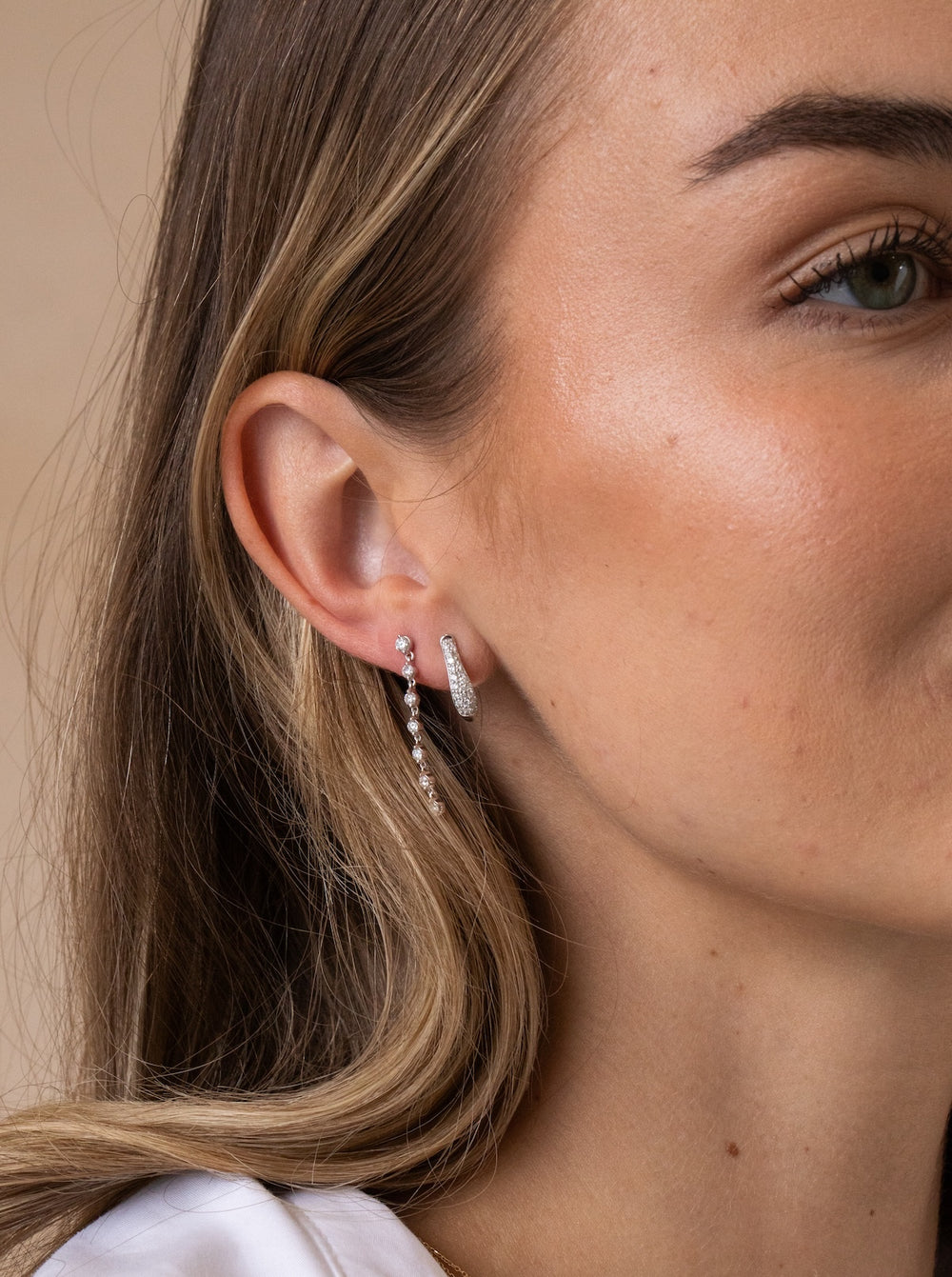 While designing this collection, I wanted to explore how pavé diamonds could feel both glamorous and effortlessly wearable. These huggies were created to capture that balance, combining layered sparkle with a silhouette that feels light, comfortable, and easy to style.