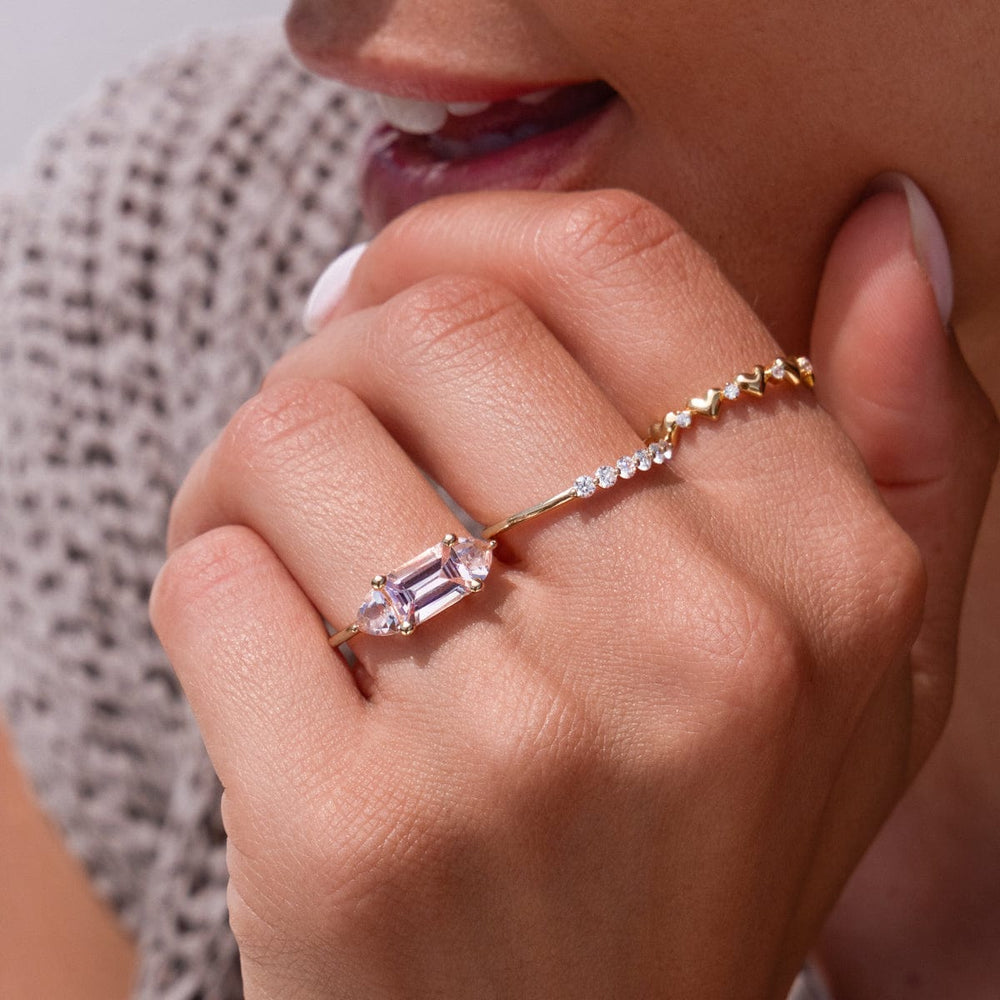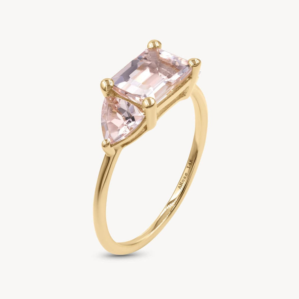 A gem of unparalleled beauty emanates a soft blush hue that exudes both warmth and elegance. Its unique orientation across the finger sets a harmonious tone, inviting admiration from every angle. Flanking this ethereal gem are two majestic trillion-cut morganites with their precisely faceted contours enhancing the ring's overall splendor.